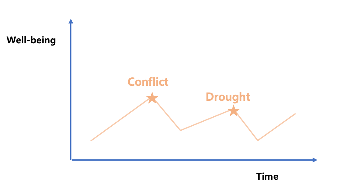 하지만, 아무리 많은 자원들이 투입되어 드라마틱한 수준으로 웰빙의 수준이 상승하더라도, 가뭄/홍수/그 외 자연재난/분쟁/시장실패 등의 위기 상황이 오면 아래 그래프와 같이 웰빙의 수준은 다시 하락하게 된다. 그 위기 상황의 영향력에 따라 하락의 폭은 매우 클 수도 있고, 다시 회복하기 어려울 수도 있다. 문제는 이와 같은 위기 상황들은 누구나 예외 없이 맞이할 수 있는 상황들이며, 특히 사회의 안전보장망이 잘 갖춰져 있지 않은 개발도상국의 주민들은 이러한 위기에 매우 취약할 수밖에 없다는 사실이다. 게다가 기후변화로 인한 위기 상황들은 더욱 더 개발도상국 주민들의 생계를 위협할 것으로 예측되고 있다.