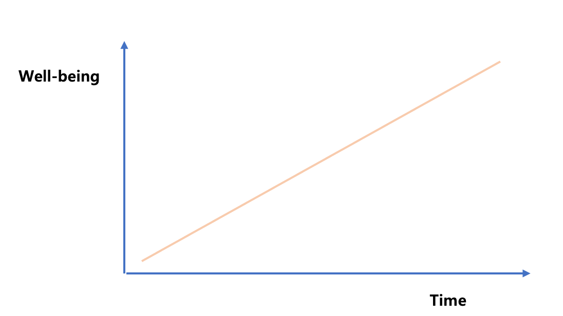일반적으로, 웰빙의 수준을 향상시키는 것, 삶의 질을 높이는 것, 이러한 표현들은 넓은 범위에서 각 개발프로젝트의 목표를 요약해 준다. 즉, 그래프에서 보듯이, 개발 프로젝트를 통해 여러 개입이 시작되면 시간이 흐름에 따라 대상자들의 웰빙(Well-being)은 상승하게 되어 있고, 이것이 개발프로젝트가 추구하는 방향이다.