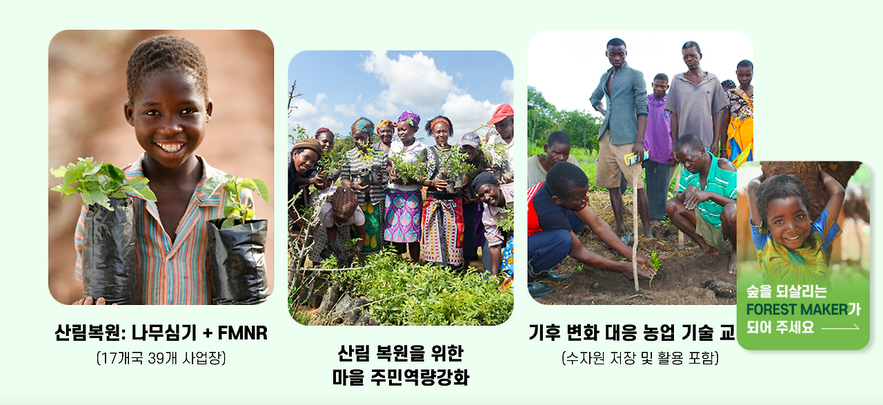 최근 인스타그램 계정에서 소개해 드렸던 월드비전 한국의 모금컨텐츠(https://www.worldvision.or.kr/campaign/2021/climate-change/21-forestmaker.asp)가 있습니다. 홈페이지 캠페인과 유투브 영상(https://youtu.be/X8a6r2ZppV4)을 통해 주민참여형 산림복원이라는 사업 컨텐츠를 심도 있게 다루면서, 사업 컨텐츠에 집중하는 모금컨텐츠를 제작했습니다. 완벽하진 않더라도, 꽤나 의미있는 도전의 컨텐츠라고 생각합니다. '월 3만원 후원, 아이들 몇명에 대한 영양식' 과 같은 지나친 단순화로 우리의 활동을 소개하는 것이 아닌, 개발NGO가 어떤 활동을 어떤 목적으로 하는지, 그 안에서 지역사회 주민들의 역할은 무엇인지, 그로 인한 기대효과들은 무엇인지 등에 대한 내용들을 자세히 설명하며 모금을 유도하는 컨텐츠이기 때문입니다.