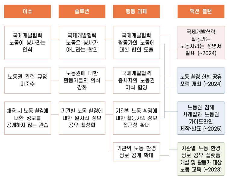 국제개발협력 분야 노동 이슈는 노동권 보장 그 밑바탕에 자리한 노동의 가치에 대한 문제입니다. 다른 직군들과 비교하여 상대적으로 더 가치있는 일을 하고 있다 라고 이야기하는 것은 아닙니다. 다만 사회적 가치에 대한 사회와 대중들의 인지도와 이해는 점점 깊어지는 만큼, 사회적 가치 창출에 앞장 서고 있는 국제개발협력 분야에서 일하는 우리의 노동 가치 역시 정당하게 인정받고 보상받고 싶을 뿐입니다. 자본주의 사회라고 할지라도 경제적 가치만을 좇아서는 우리 사회가 건강하게 지속될 수 없음을 더욱 많은 이들이 인식해 가는 지금, 국가·인종·성별과 관계없이 사회적 가치 창출을 위해 일하는 국제개발협력의 가치는 결코 작지 않습니다.