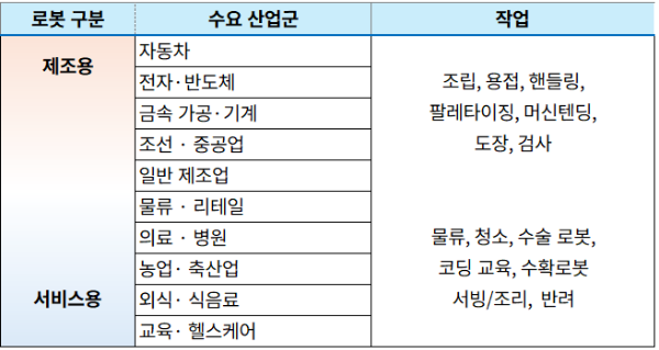 제조용과 서비스용 로봇 분류를 기준으로 수요 산업과 로봇의 쓰임(작업)을 정리해 보면 다음과 같다. 이러한 구분은 로봇이 수요 산업에 어떻게 쓰일 것인가? 의 관점이다.