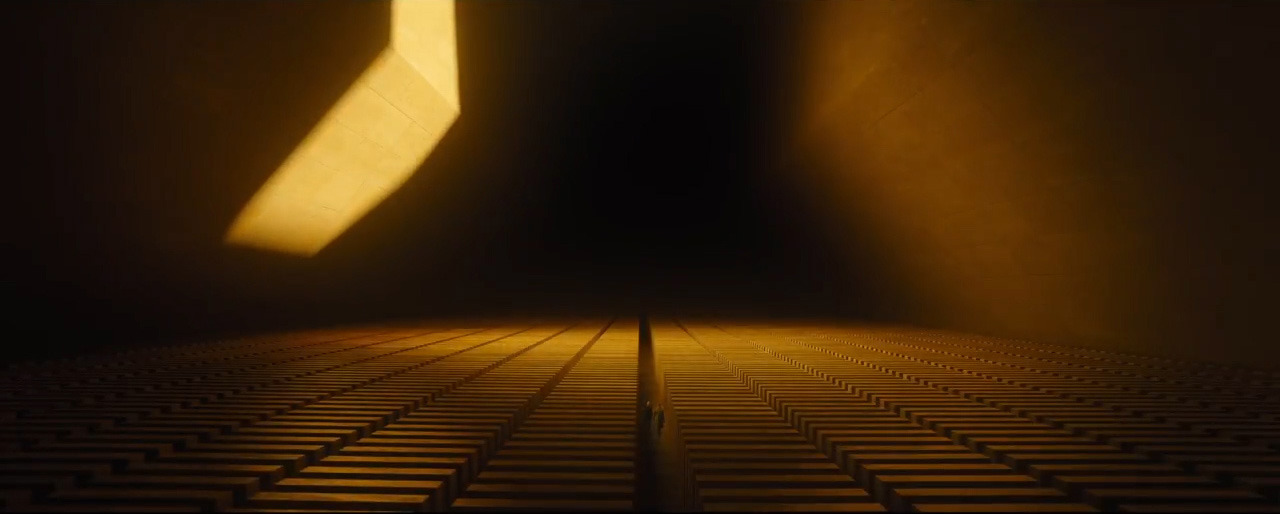 <블레이드 러너 2049>가 미래의 로스앤젤레스를 담아내며 가장 공들였을 시각적 요소는 단연 건축물로 사료된다. 이는 2049년의 로스앤젤레스를 부감하는 첫 장면부터 관객을 압도하며 다가온다. 건축물군 뿐만이 아니다. 거리에서 마주하는 개별 건물들 또한 로스앤젤레스라는 도시의 기억을 지닌 채로 그 처절한 황량함을 누락 없이 응축한다. 이 같은 감상은 K(라이언 고슬링)가 찾아간 월레스 사의 내부에 이르면 충만할 대로 충만해진 미적 쾌감을 선사한다. 군더더기가 없어 일견 미니멀리즘으로만 표상되기 쉬우나, 스케일의 조작을 통한 신성성의 구현은 단지 ‘멋들어진’ 공간을 표현하는 것만이 이 영화의 목표가 아니었음을 다시금 상기시킨다.