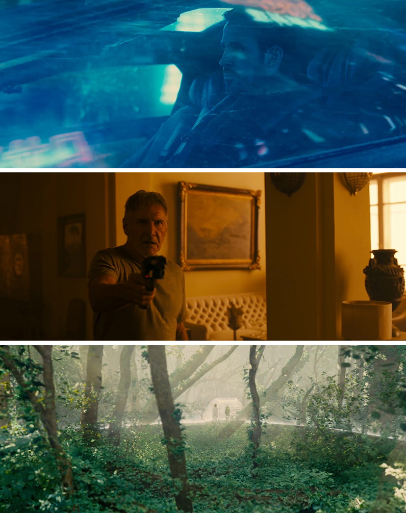 <블레이드 러너 2049>가 시각적으로 얼마나 섬세한 계획을 지닌 작품인지는 색상을 통해서도 드러난다, 푸른색이 주요 배경이 되는 K의 세상과 붉은색으로 뒤덮인 헤커드의 세상은 명확한 대비를 이룬다. 하지만 이는 쉽게 관객에게 발견당하지 않으면서도, 이 두 인물의 관련성이 -K의 바람과는 달리- 멀어져 있음을 암시한다. 이처럼 둘로 나누어진 색의 구성에서 유독 데커드의 딸(카를라 유리 분)이 있는 공간만은 일시적이나마 생명력을 상기시키는 초록색으로 선보여지며 영화의 결말과 조응한다. 플롯과 색상계획이 별개가 아닌 치밀한 계획에 의하여 구성되고 설계되었음을 보여주는 장면들이라 할 수 있는 것이다.