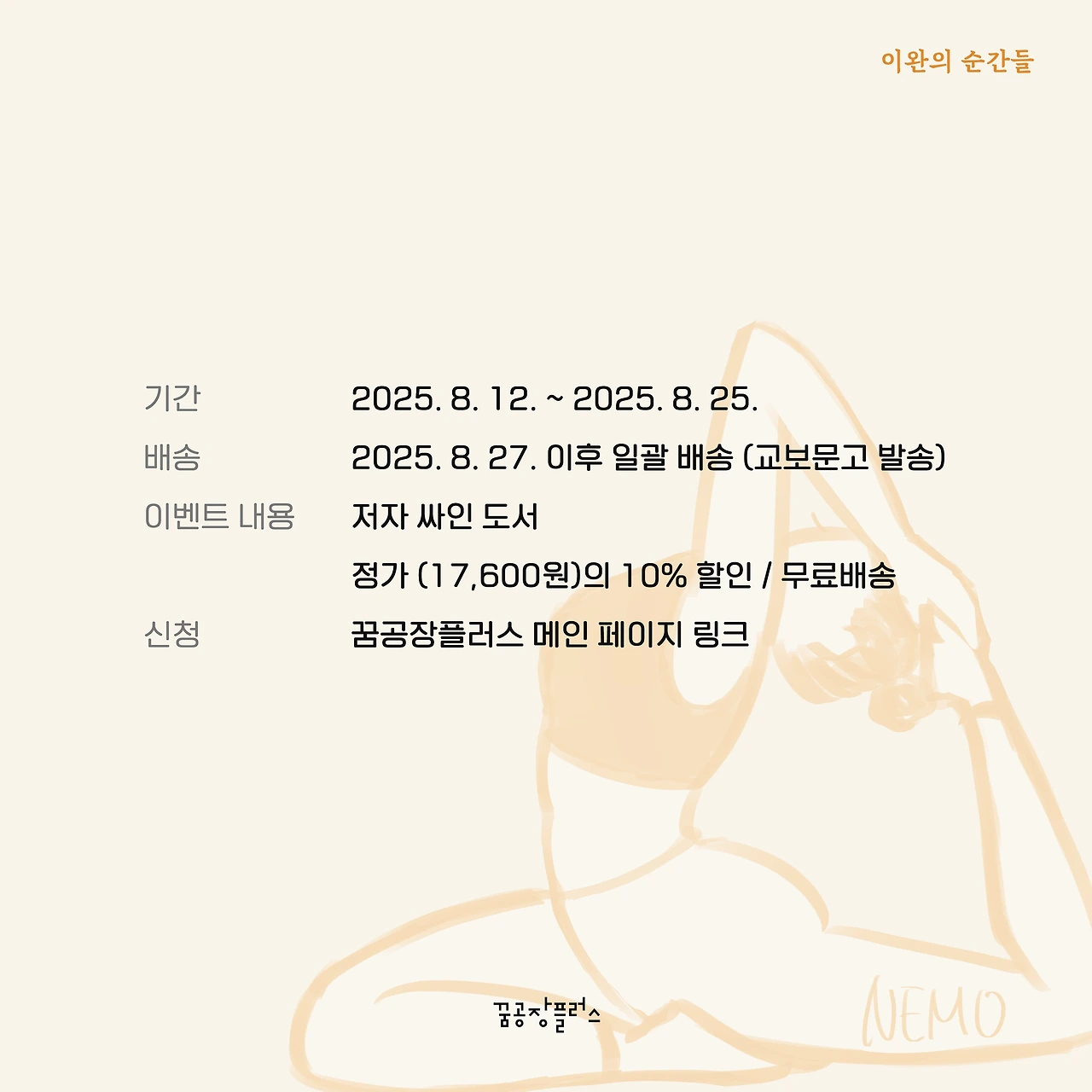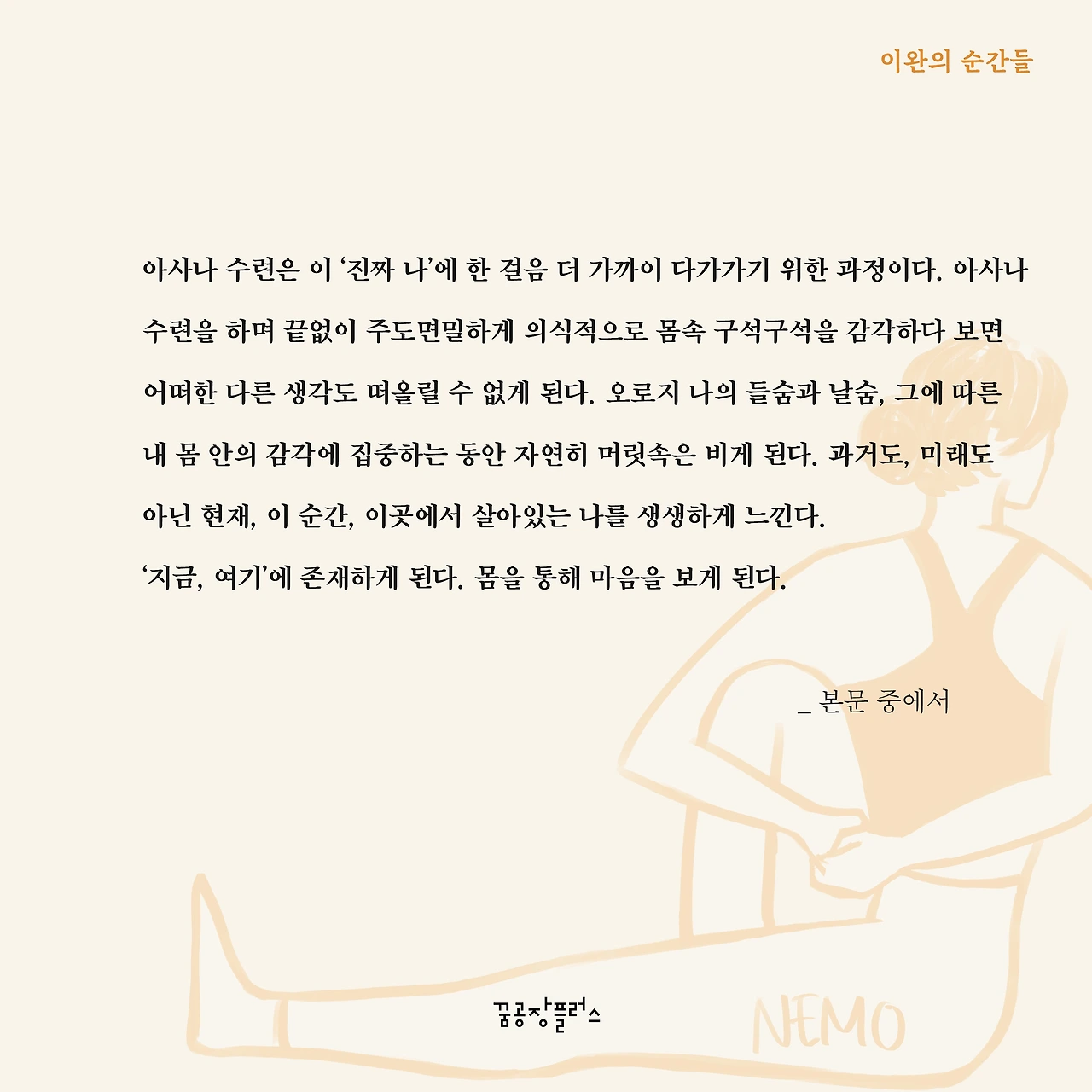 이 책과 함께 하는 시간이 독자분들께 이완의 순간이 되면 좋겠습니다. 긴장했던 어깨를 내려놓고 나의 숨을 찾는 시간이 되면 좋겠습니다.