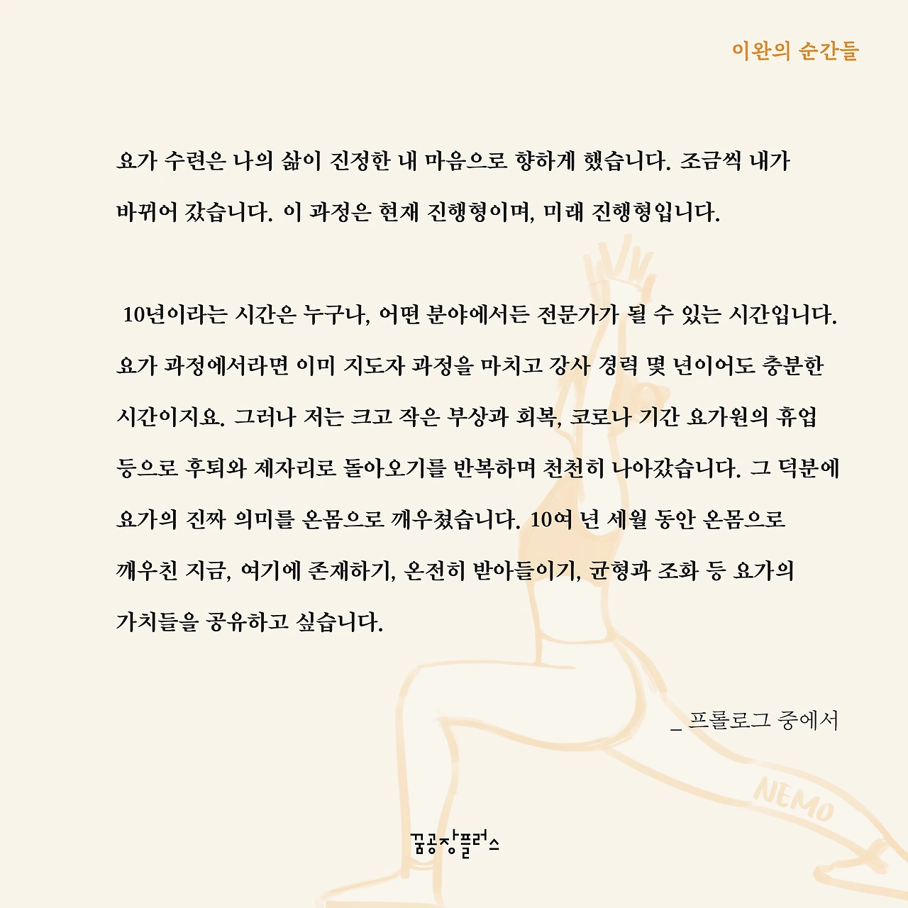 이토록 좋은 요가를 더 많은 사람들이 알면 좋겠다, 이런 나도 하는데 당신이 못할 이유가 없다, 요가의 진짜 좋은 점은 단지 예쁜 몸매, 건강한 몸이 아니라 더 본질적인 것 '나다움'을 찾는 것이다, 라는 것을 말하고 싶어 글을 썼어요.