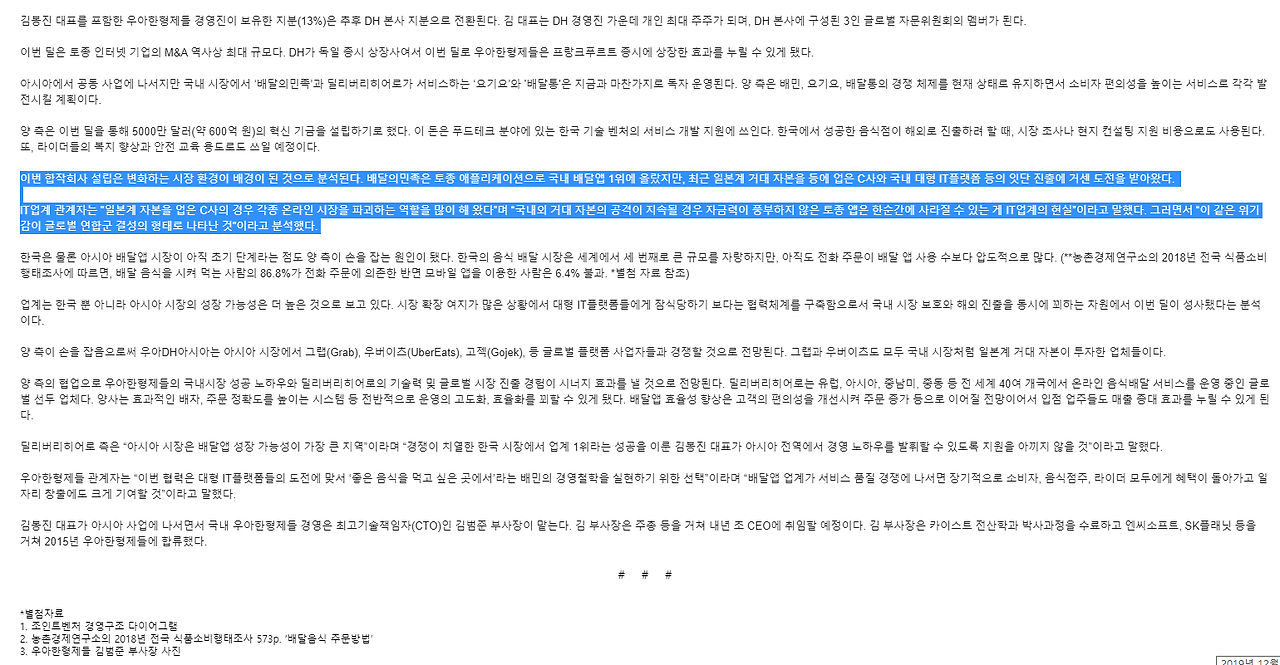 IT업계 관계자는 "일본계 자본을 업은 C사의 경우 각종 온라인 시장을 파괴하는 역할을 많이 해 왔다”며 “국내외 거대 자본의 공격이 지속될 경우 자금력이 풍부하지 않은 토종 앱은 한순간에 사라질 수 있는 게 IT업계의 현실”이라고 말했다. 그러면서 “이 같은 위기감이 글로벌 연합군 결성의 형태로 나타난 것"이라고 분석했다. - 우아한형제들 13일 자 보도자료 중 발췌
