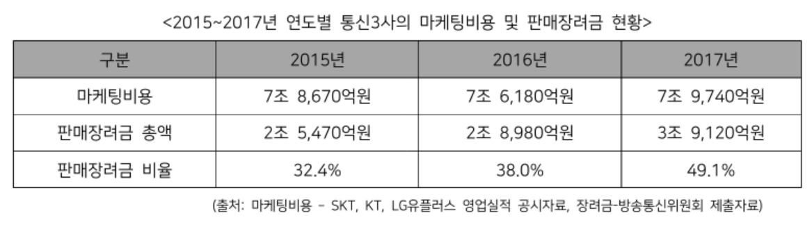 그림 4. 국내 이동통신 3사의 마케팅 비용 및 판매장려금 현황 (출처: 이통 3사 공시자료 취합)
