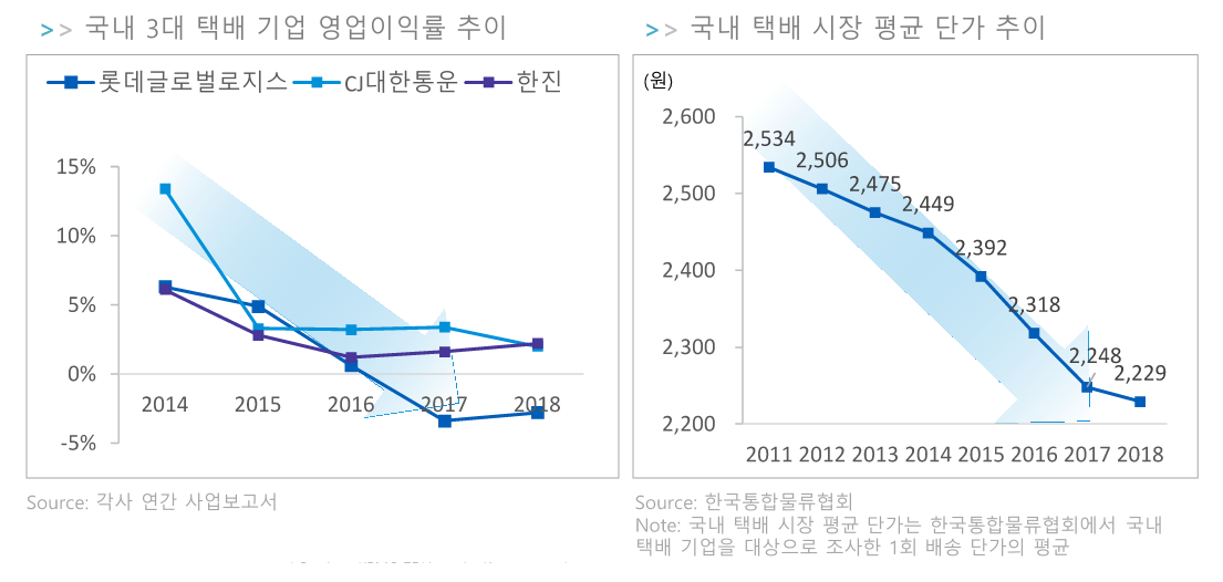 덧붙이자면 택배 4위인 로젠택배가 현재 인수·합병을 추진 중이다. 이 회사의 연간 매출액은 6,235억 원이다. 금융권에서는 매각가만 4,500억 원 수준이다. 롯데(매출 8,149억 원)가 로젠을 인수할 경우 1위 CJ(매출 2조 6,482억 원)를 추격할 수 있는 발판을 마련하게 된다.