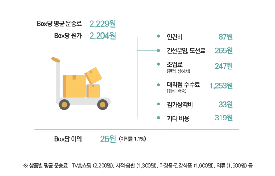 원가 분석을 좀 더 깊게 살펴보면 인건비 87원, 간선 운임(도선료) 265원, 조업료(환적, 상하차) 247원, 대리점 수수료(집하, 배송) 1,253원, 감가상각비 33원, 기타 319원으로 구성됐다. CJ, 한진, 롯데 등 택배사마다 차이가 있을 수 있지만 엇비슷한 구조다.