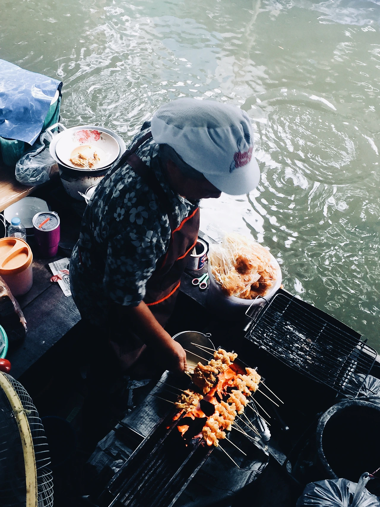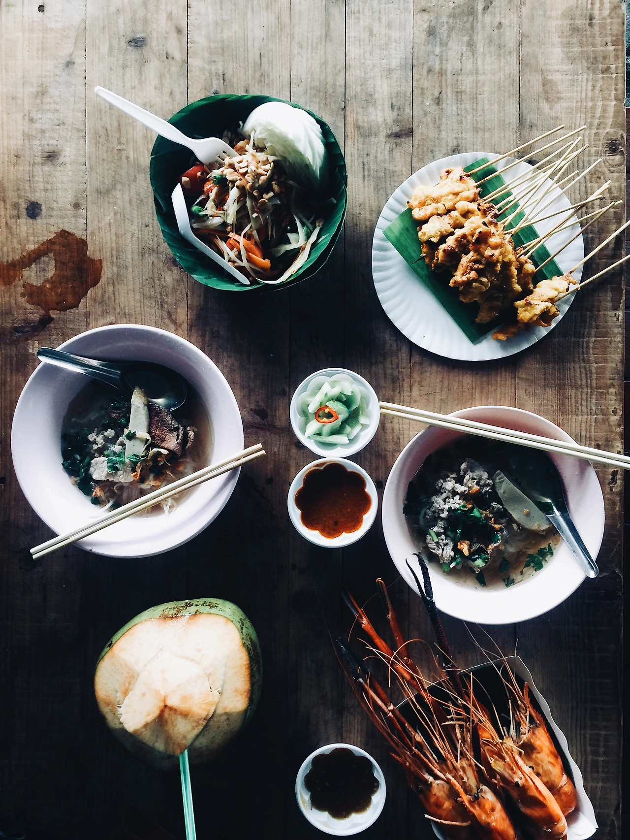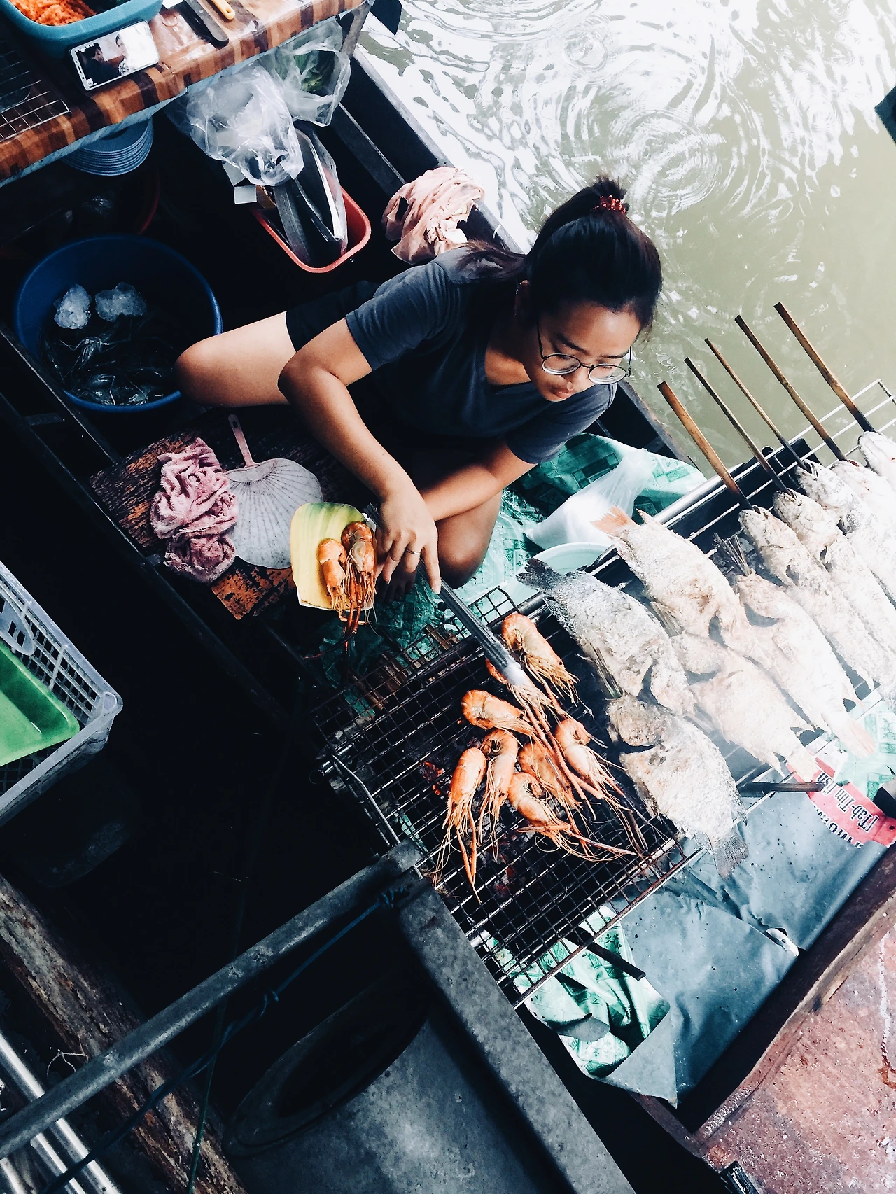 뭘 먹을지 고르면서 사진을 열심히 찍은지 얼마 지나지 않아 친구가 마켓에 도착했다. 먼저 온 내가 먹고 싶었던 것을 보여주며 가이드 역할을 하다보니, 어느 새 찾아온 허기가 뱃 속을 급격하게 관통했다. 서로 300바트 씩 각출하기로 하고, 먹고 싶은 것을 맘껏 시켰다. 파파야로 만든 시큼한 ‘솜땀 (Somtam)’ 샐러드, 보트 안에서 구운 즉석 새우요리, 치킨 꼬지, 돼지고기를 넣은 국물이 얼큰한 면 요리에 코코넛까지 주문했는데도 돈이 남았으니, 약 만 원 남짓한 돈으로 왕처럼 먹을 수 있는 태국의 저렴한 물가가 새삼 고맙게 다가왔다.