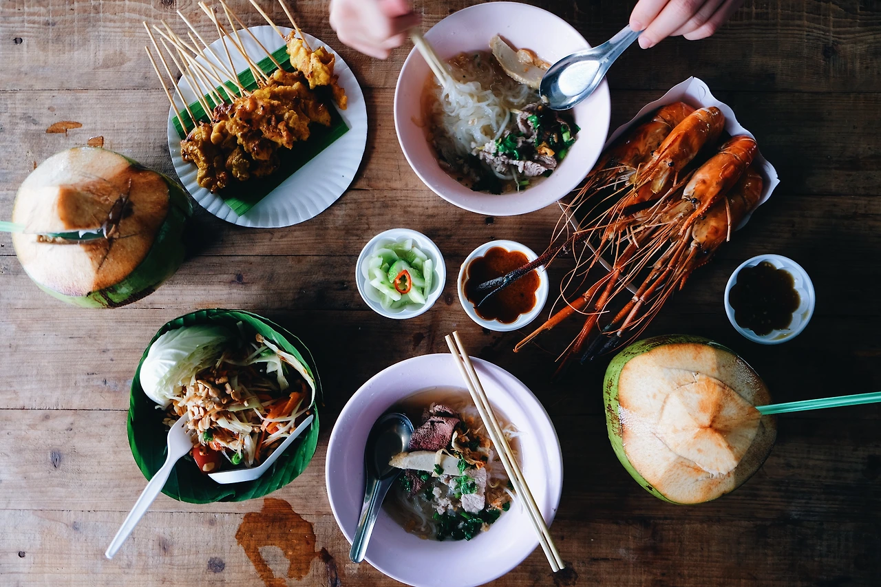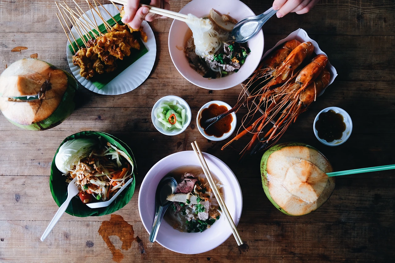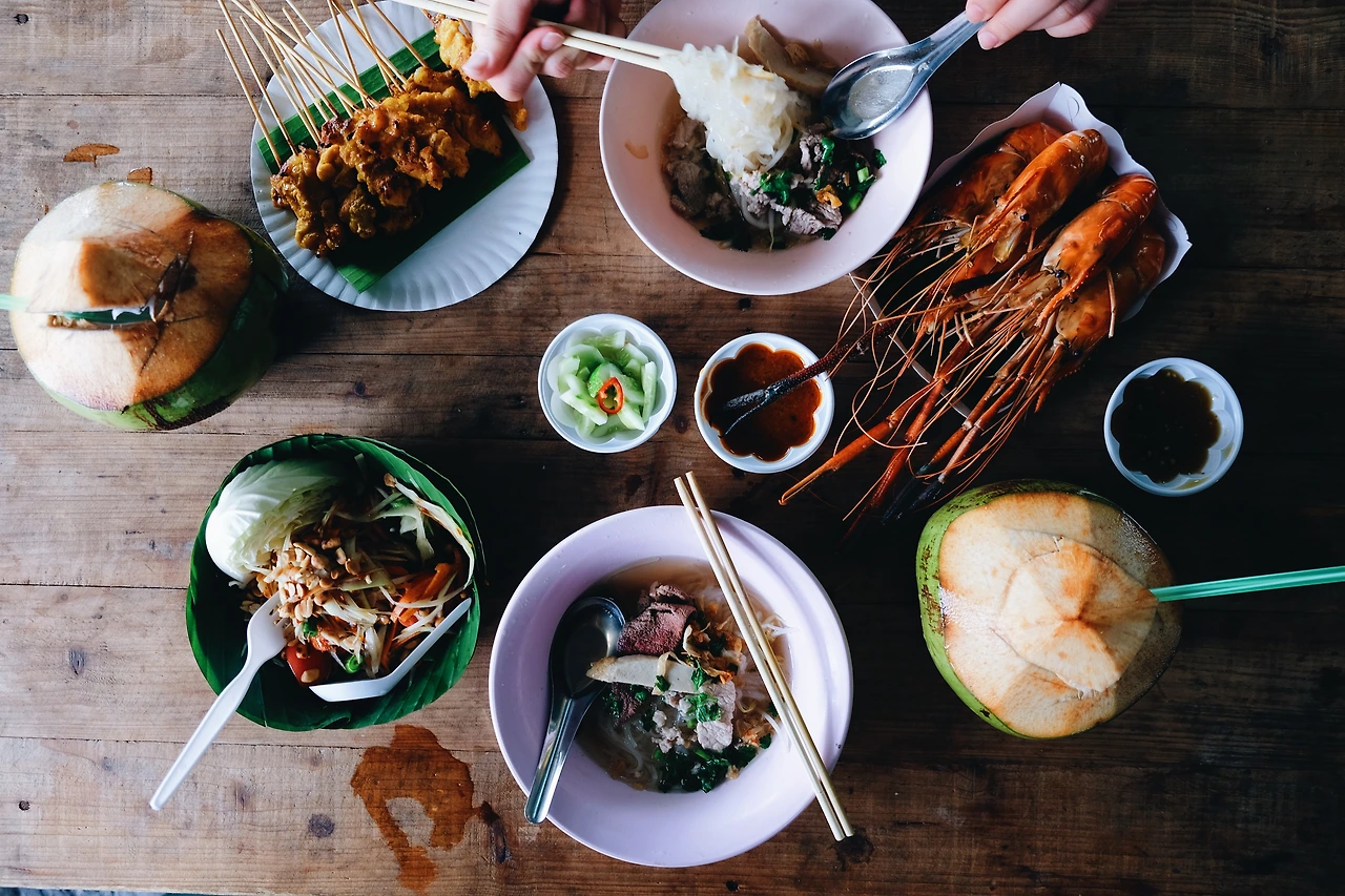 뭘 먹을지 고르면서 사진을 열심히 찍은지 얼마 지나지 않아 친구가 마켓에 도착했다. 먼저 온 내가 먹고 싶었던 것을 보여주며 가이드 역할을 하다보니, 어느 새 찾아온 허기가 뱃 속을 급격하게 관통했다. 서로 300바트 씩 각출하기로 하고, 먹고 싶은 것을 맘껏 시켰다. 파파야로 만든 시큼한 ‘솜땀 (Somtam)’ 샐러드, 보트 안에서 구운 즉석 새우요리, 치킨 꼬지, 돼지고기를 넣은 국물이 얼큰한 면 요리에 코코넛까지 주문했는데도 돈이 남았으니, 약 만 원 남짓한 돈으로 왕처럼 먹을 수 있는 태국의 저렴한 물가가 새삼 고맙게 다가왔다.