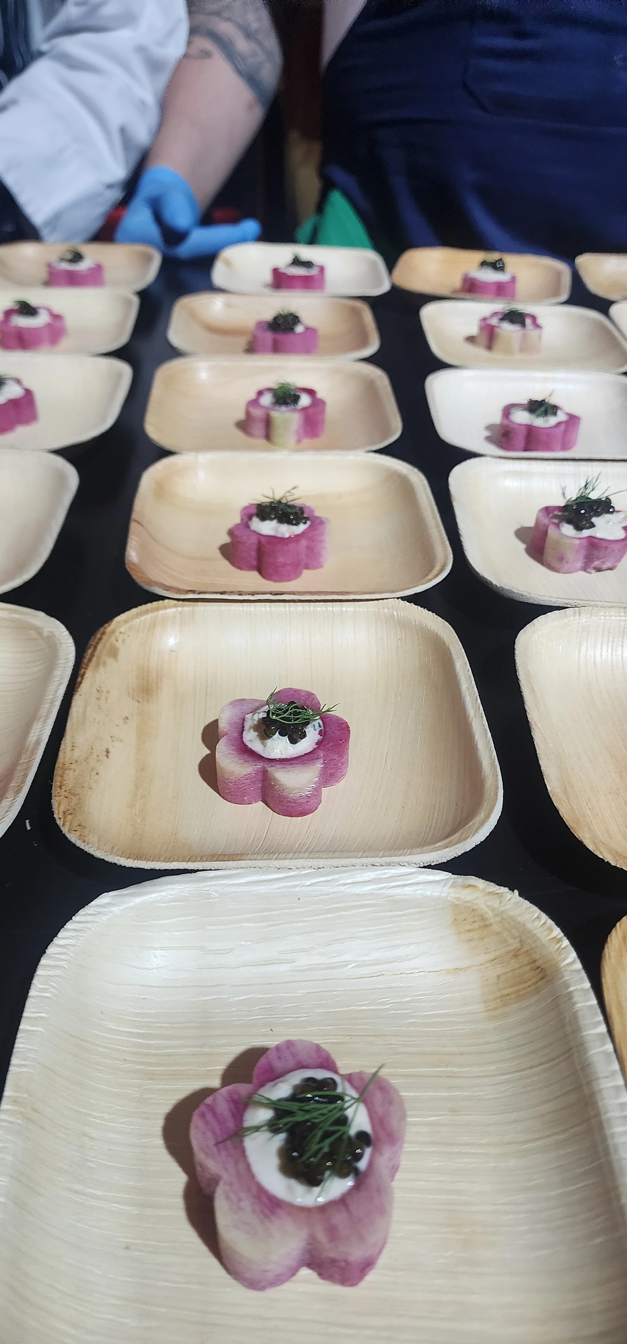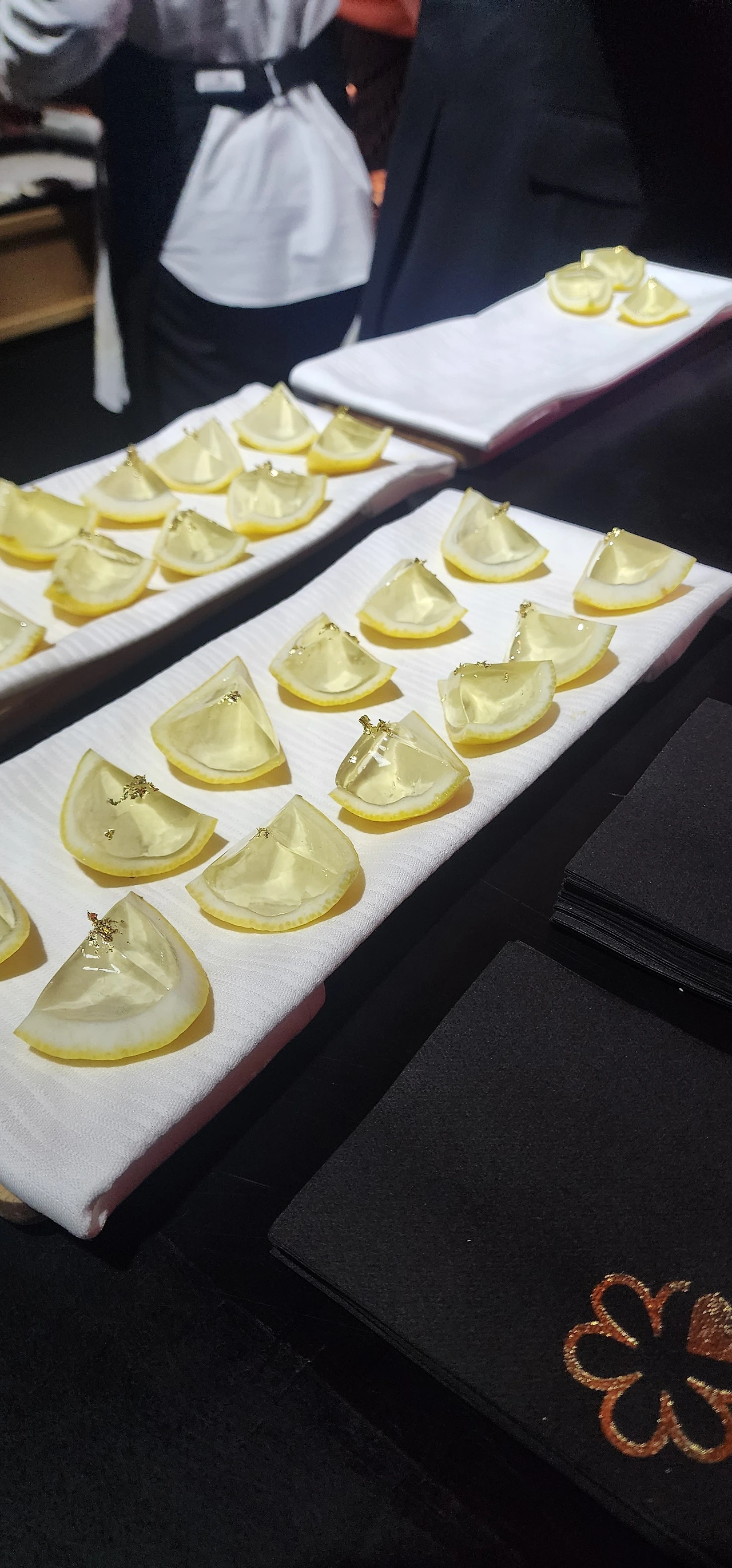 행사장 안에는 내가 밴쿠버에서 가장 애정하는 식당 중 하나인 'Published on Main'과 AnnaLena, 49th Parallel Coffee Roasters, 그랜빌 아일랜드에 위치한 요리 학교인 Pacific Institute of Culinary Arts (PICA)에서 한 입 거리와 음료를 제공해 주었다. Published에서는 미슐랭 별 모양으로오려낸 무(Watermelon Radish)에 캐비어와 크림치즈, 딜 허브를 올린 핑거 푸드를 준비했고, 49th Parallel 커피 로스터즈에서는 에스프레소 커피의 크레마가 풍부한 커피 마티니 칵테일을 준비했지만 단연 돋보였던 것은 AnnaLena에서 준비한 입가심용 레몬젤리와 생 굴이었다. 바닐라를 첨가한 크림 거품을 올린 굴이 달콤하고 신선하게 다가왔다.