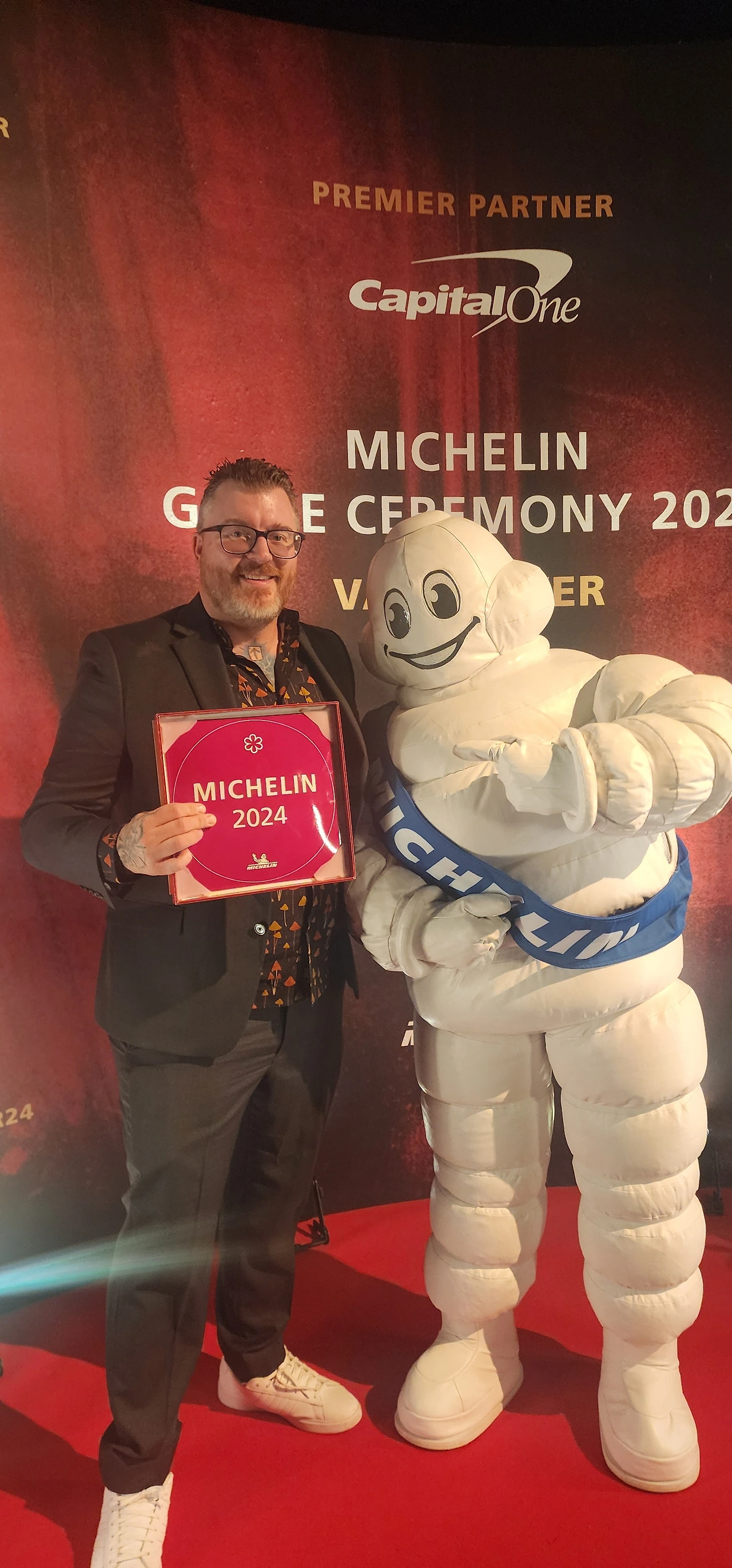 본격적으로 이 글을 쓰기에 앞서 사실 솔직히 고백하자면, 이번 미슐랭 세레모니에 정식으로 초대를 받은 것은 아니었다. 평소 친분이 있던 베트남 식당 <안앤치: Anh and Chi>를 운영하는 친구의 잠입 시도 꼬드김에 넘어가 입구에서 뺀찌(?)를 맞지 않도록 커스텀 핑크 슈트를 빼어 입고 행사장에 도착했다. 다행히도 도착하자마자 입장하고 있는 에디터 분을 마주쳤고, 자연스레 인사를 하며 QR 코드 스캔을스킵하고 곧장 행사장 안으로 안내받았다. 들어가자마자 같이 여러 번 작업한 적이 있는 비디오그래퍼 및 촬영 감독인 마크와 크리스가 반갑게 나를 맞아주었고, 초대장이 없지만 무사히 들어온 나를 열렬히 환영해 주는 그들 덕분에 한결 마음 편히 즐겁게 이벤트를 즐길 수 있었다.