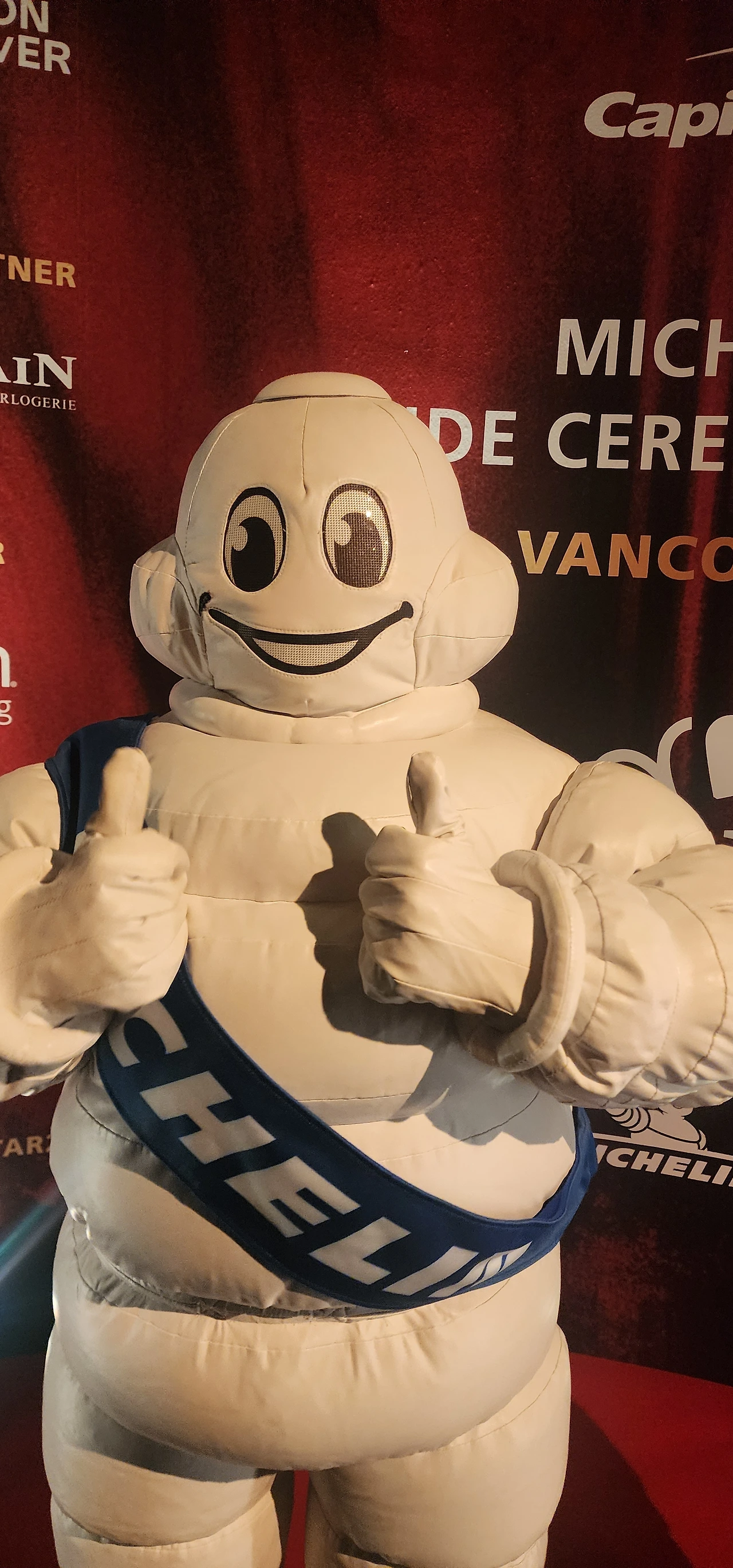빨간 장미로 장식된 레드카펫을 밟으며 2층으로 올라와서 코트를 맞긴 후 우리를 맞이해 주는 것은 미쉐린 타이어맨이었다. 하얀색 지방층 혹은 마시멜로가 두텁게 쌓인 듯한 코스튬을 입고 한결같은 미소로 손님들을 맞이하며 포토월에서 친절하게 사진을 찍어주었다.