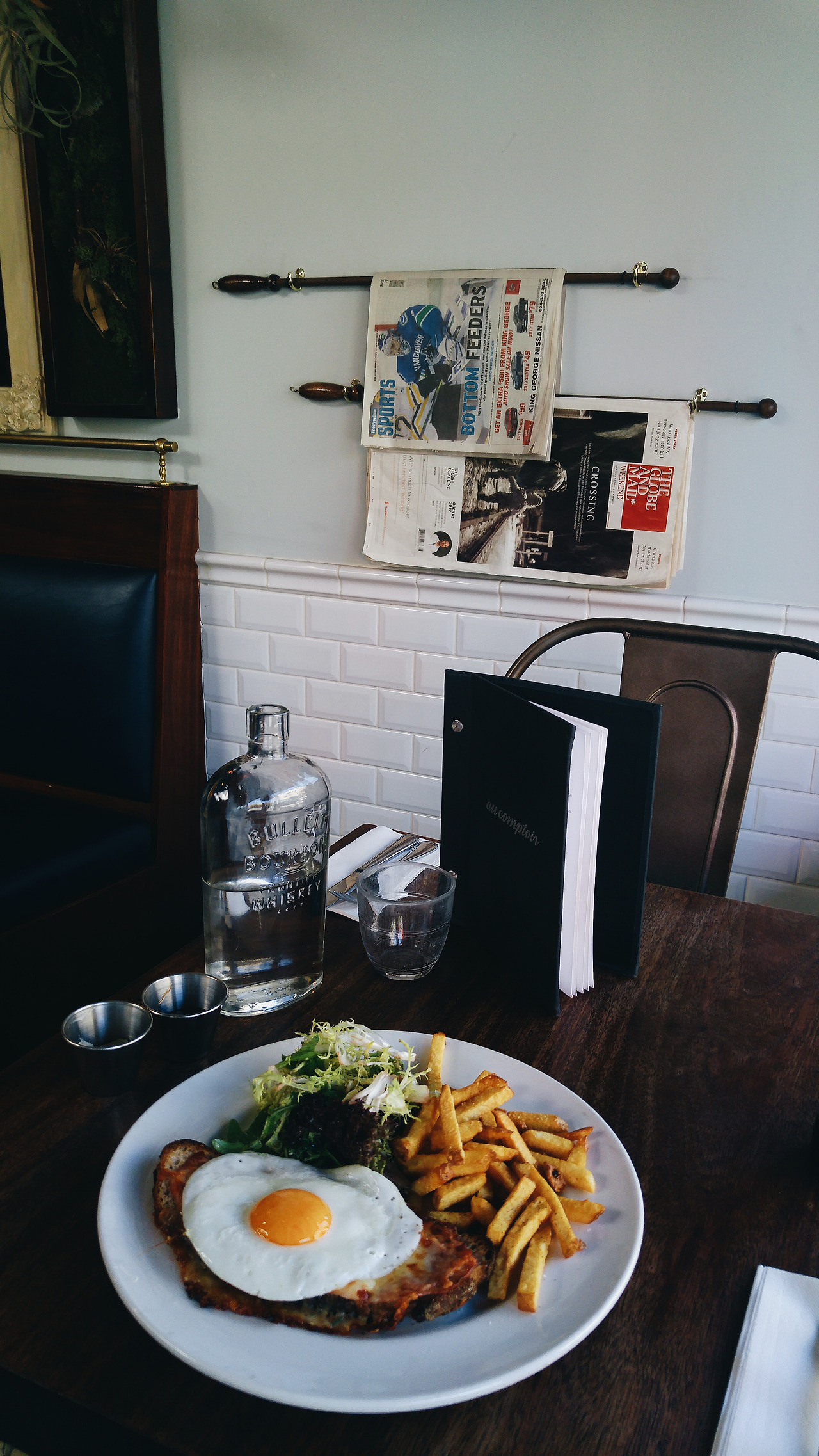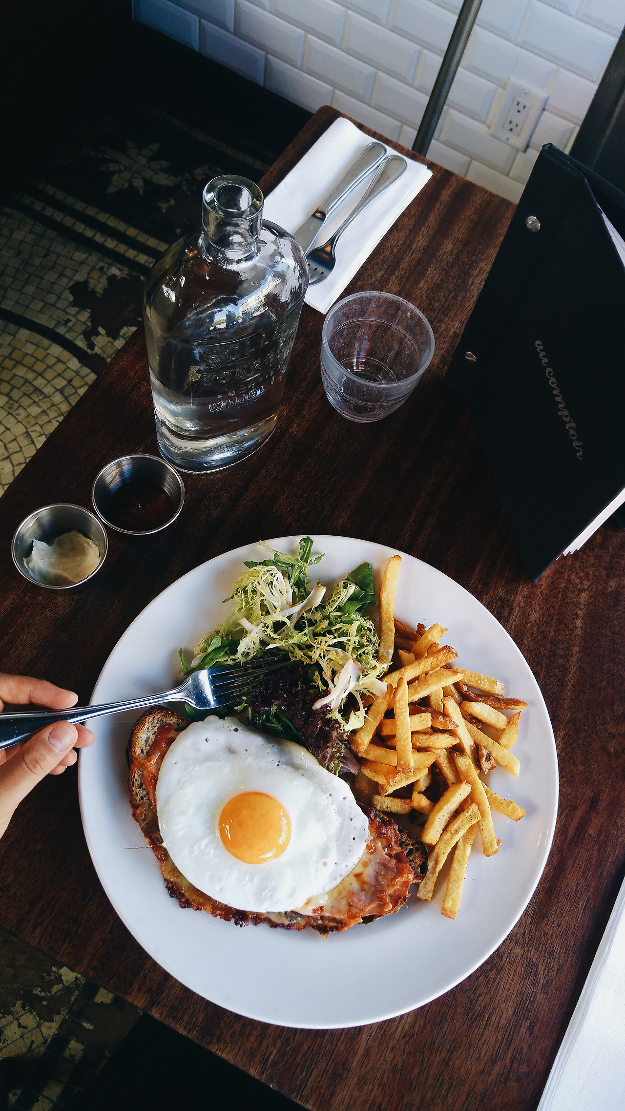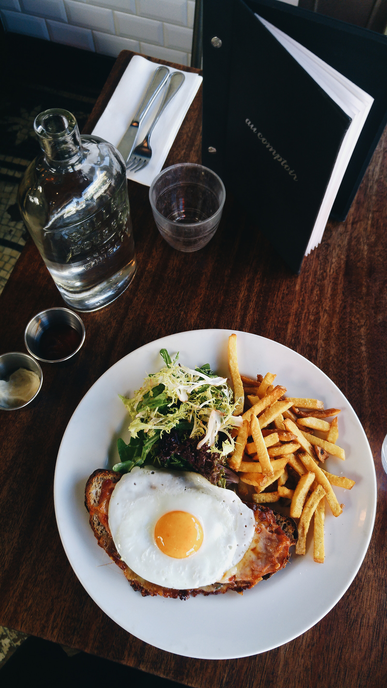 메뉴를 볼 것도 없이, 내가 이 곳에 오면 항상 시키는 Croque-madame (크로크-마담: Gyuyere 치즈와 햄, 그리고 sunnyside up, 즉 노른자가 터지지 않고 위로 올라와 있는 계란 후라이를 얹은 샌드위치)을 주문했다. 주문을 넣은 지 20여 분 쯤 지났을까, 인스타그램을 확인하고 식당 내부의 사진을 찍고서 사람 구경에 한참 빠져있을 찰나, Voilà! 하고 내 앞에 쌉싸름함과 떫음을 겸비한 샐러드와 프렌치 프라이를 곁들인 크로크 마담 샌드위치가 나타났다.