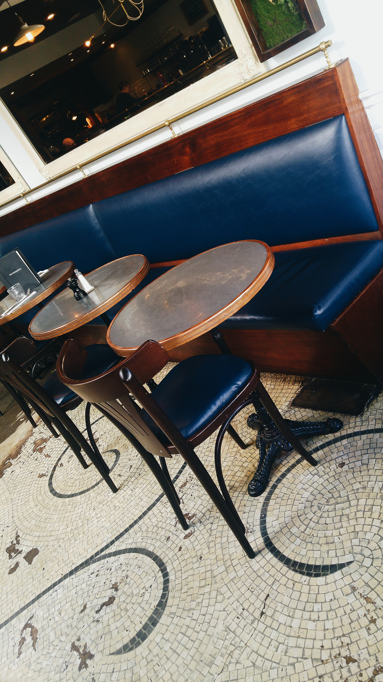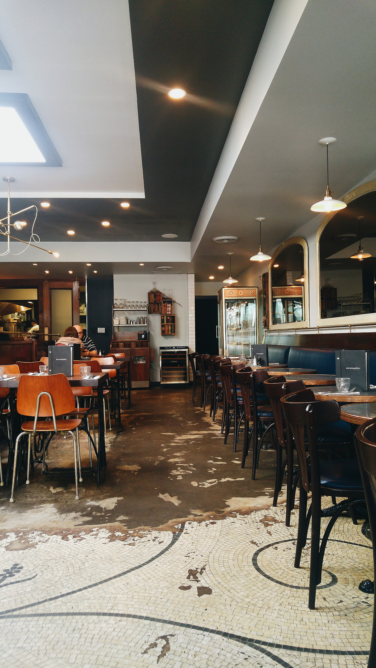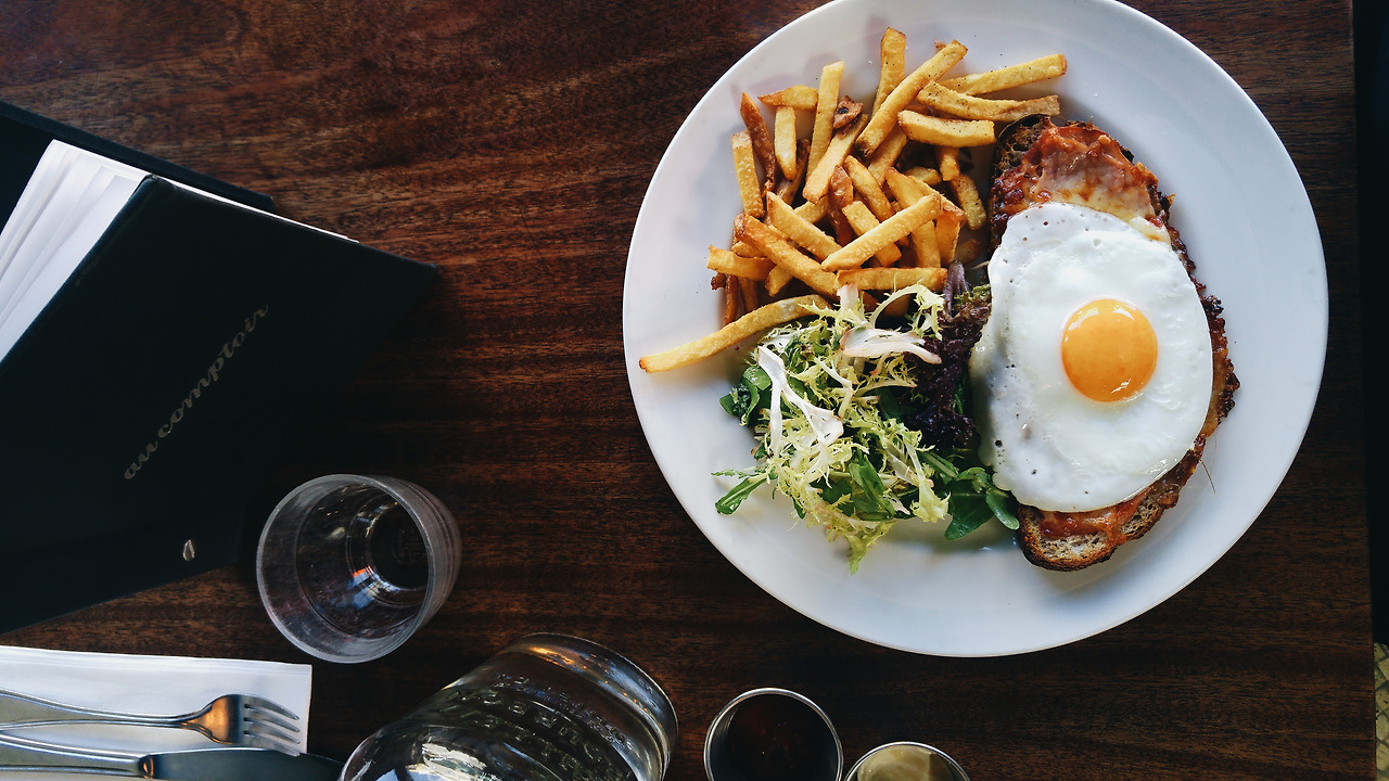 메뉴를 볼 것도 없이, 내가 이 곳에 오면 항상 시키는 Croque-madame (크로크-마담: Gyuyere 치즈와 햄, 그리고 sunnyside up, 즉 노른자가 터지지 않고 위로 올라와 있는 계란 후라이를 얹은 샌드위치)을 주문했다. 주문을 넣은 지 20여 분 쯤 지났을까, 인스타그램을 확인하고 식당 내부의 사진을 찍고서 사람 구경에 한참 빠져있을 찰나, Voilà! 하고 내 앞에 쌉싸름함과 떫음을 겸비한 샐러드와 프렌치 프라이를 곁들인 크로크 마담 샌드위치가 나타났다.