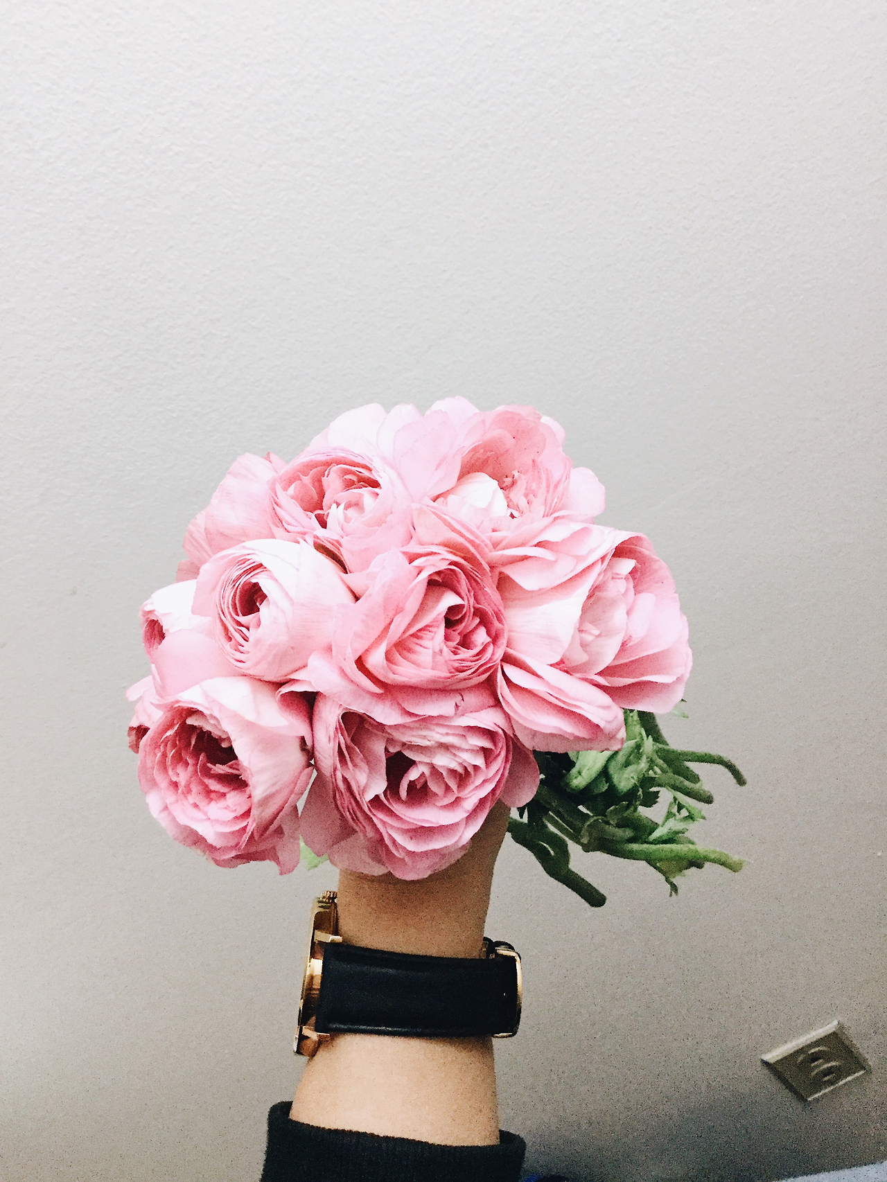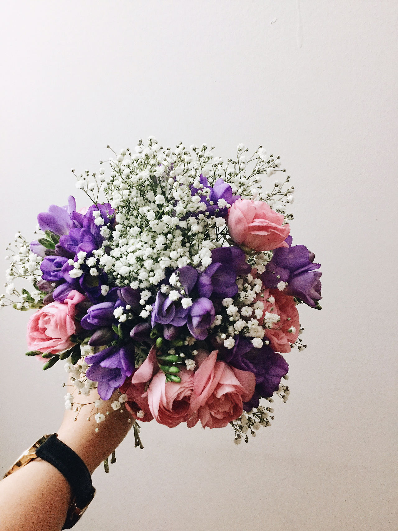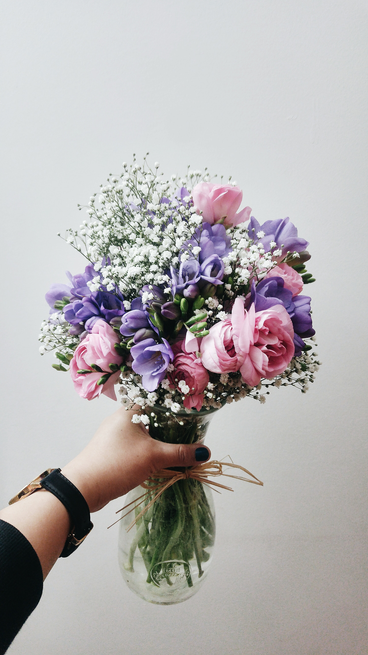 이토록 아름다운 꽃들을 한아름 안고 집으로 돌아와, 새로이 정렬을 해 나가기 시작했다. 처음에는 잔 가지들 때문인지 엉키고 설키는 바람에 중심을 잡기가 힘들었지만, 차차 잔 가지들을 솎아내고 잘라내는 과정을 반복하다보니 어느 정도 중심이 잡혀 나가기 시작했다. 왼손으로 다발을 쥐고, 프리지아와 라넌큘러스가 예쁘게 균형을 이룰 수 있게 모양을 잡아 나갔다. 서서히 내가 원하는 모형을 이룬 꽃다발에 안개꽃으로 빈 자리를 채워나가니, 어느새 내가 원하는 모습의 꽃다발이 만족스럽게 완성되었다.