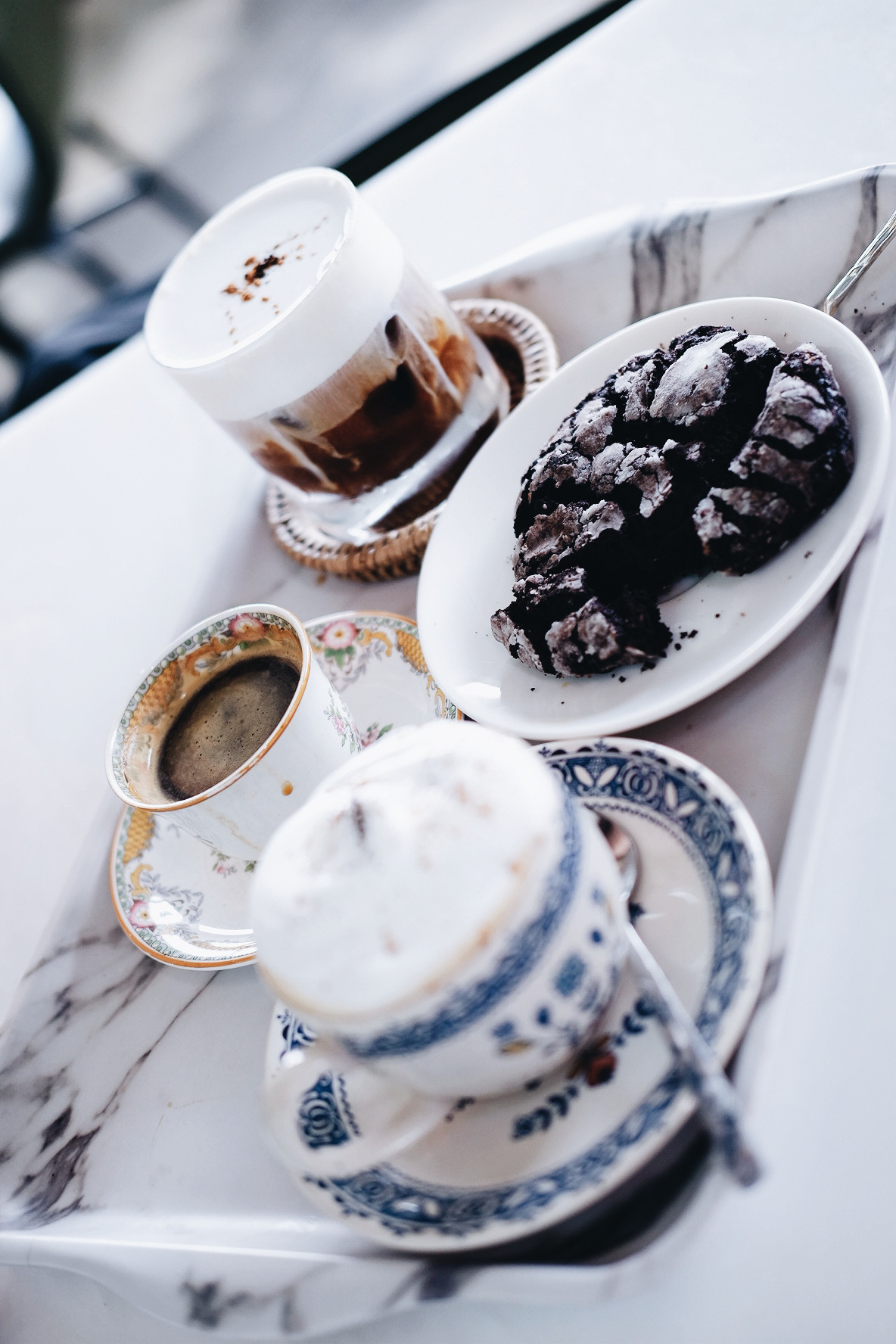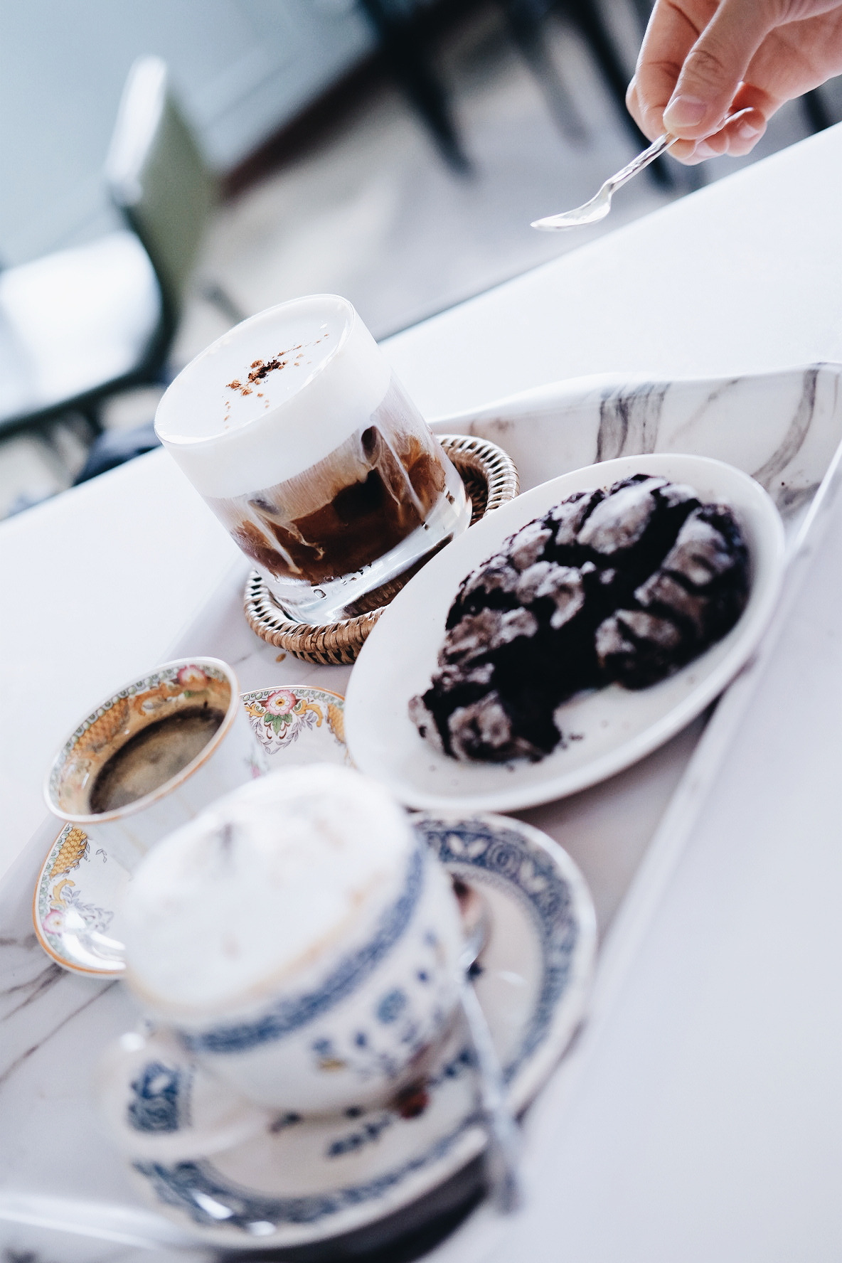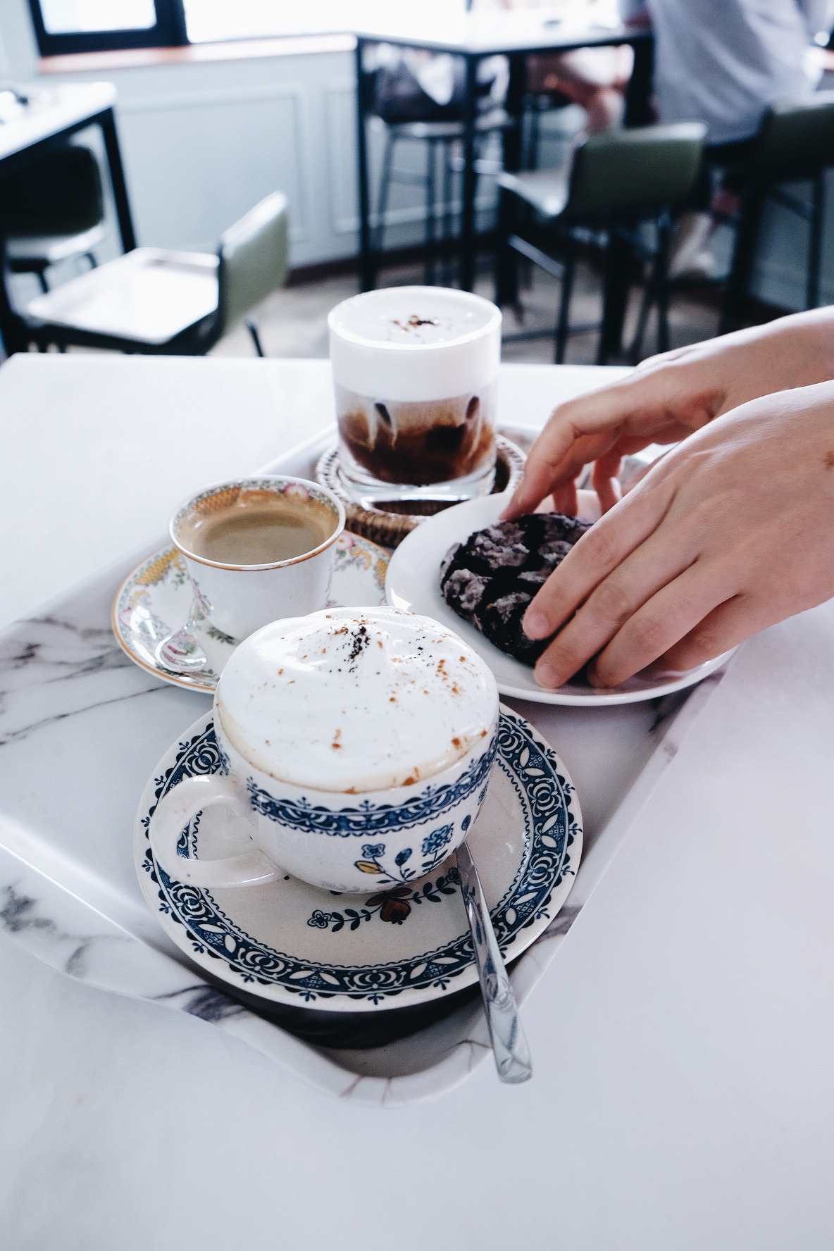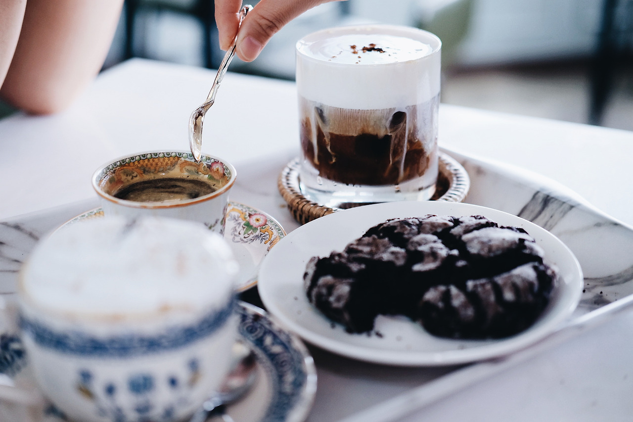 눈 앞에서 몽글몽글한 휘핑크림이 얹어지는 커피를 보며, 사탕을 먹고 싶어 하는 아이처럼 곧 맛보게 될 씁쓸하고도 달콤한 커피를 초조하게 기다린 지 몇 분이 지난 후, 드디어 우리가 주문한 메뉴가 나왔다. 3층의 하얀 대리석 테이블에 앉은 우리는 커피에 예의를 다할 수 있게 최대한 빨리 사진을 찍은 후 커피를 한 모금씩 마시기 시작했다. 내가 주문한 따뜻한 아인슈페너 위에 얹어진 달콤한 휘핑크림의 맛은 기대한 그 이상이었다. 왜 친구가 이 카페를 입이 마르지 않도록 칭찬해 온 건지에 대한 이유가 뼈저리게 이해가 되는 순간이었다. 달달한 휘핑크림 사이로 삐져나오는 씁쓸한 커피의 풍미가 조화로운 대조를 잘 이루고 있었다. 친구가 시킨 쿠키를 게 눈 감추듯 먹어치운 먹성 좋은 우리는, 수다 꽃을 한참 피운 후 범고래 다방에 다음을 기약하며 집으로 돌아왔다.