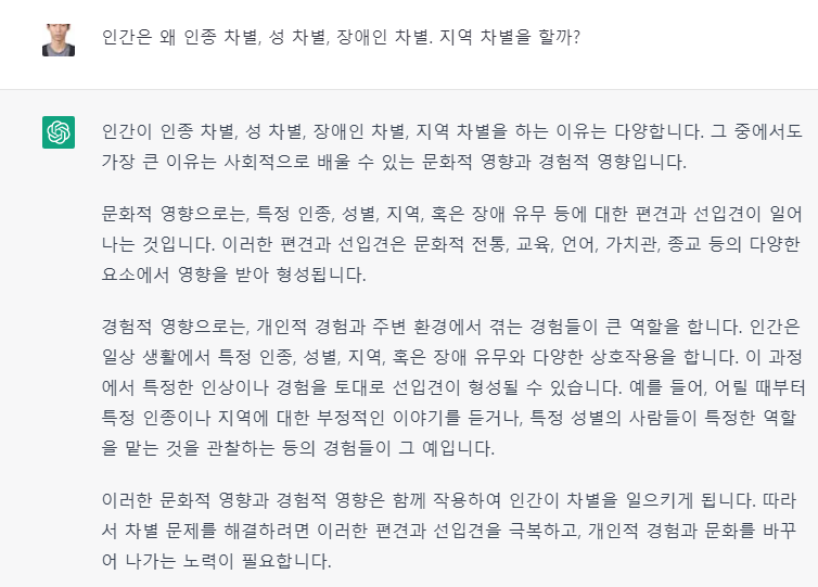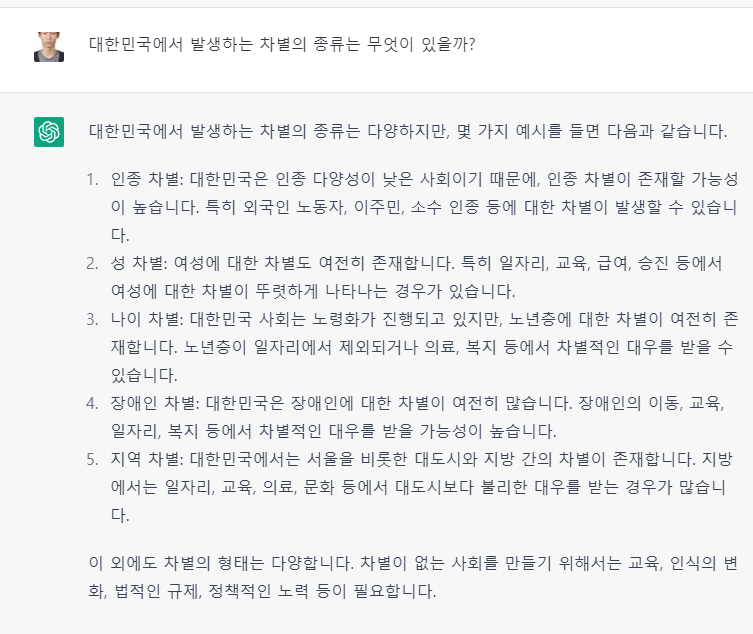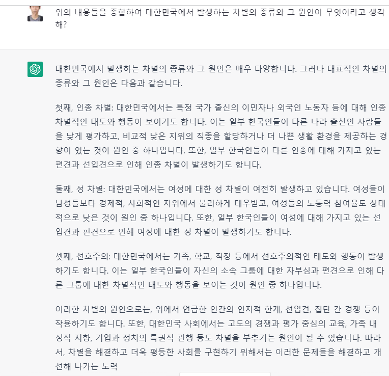 등의 질문을 통해 기존의 초안을 비판적으로 분석하게 하는 것이다. 또한 이를 종합하여 Chat GPT에 다시금 ‘위의 내용들을 종합하여 대한민국에서 발생하는 차별의 종류와 그 원인이 무엇이라고 생각해?’라고 질문하였을 때, 다음과 같은 답을 얻을 수 있었다.