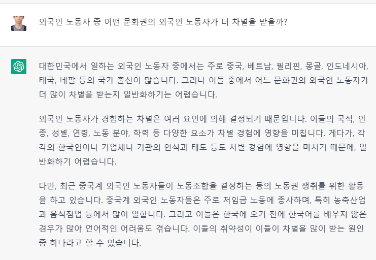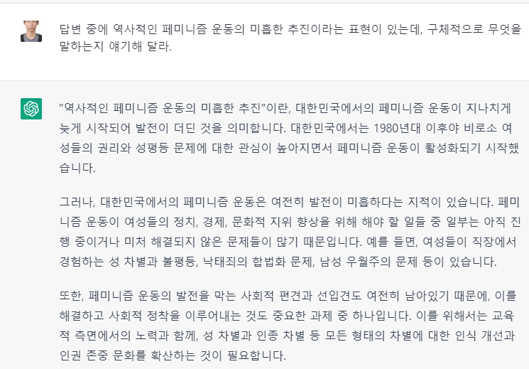 무료 버전을 활용한 것이기에 분량이 제한되어 있지만, 유료버전을 활용한다면 훨씬 더 풍부한 답을 얻을 수 있을 것이다. 또한 외국인 노동자 중 소위 '서양권' 노동자에 대한 언급이 없는 점, 페미니즘 운동에 대한 모호한 서술 등에 대해 꼬리질문을 더해가는 것도 풍부한 답을 얻을 수 있게 할 것이다(분량이 너무 길어져서 넣지 않았다).