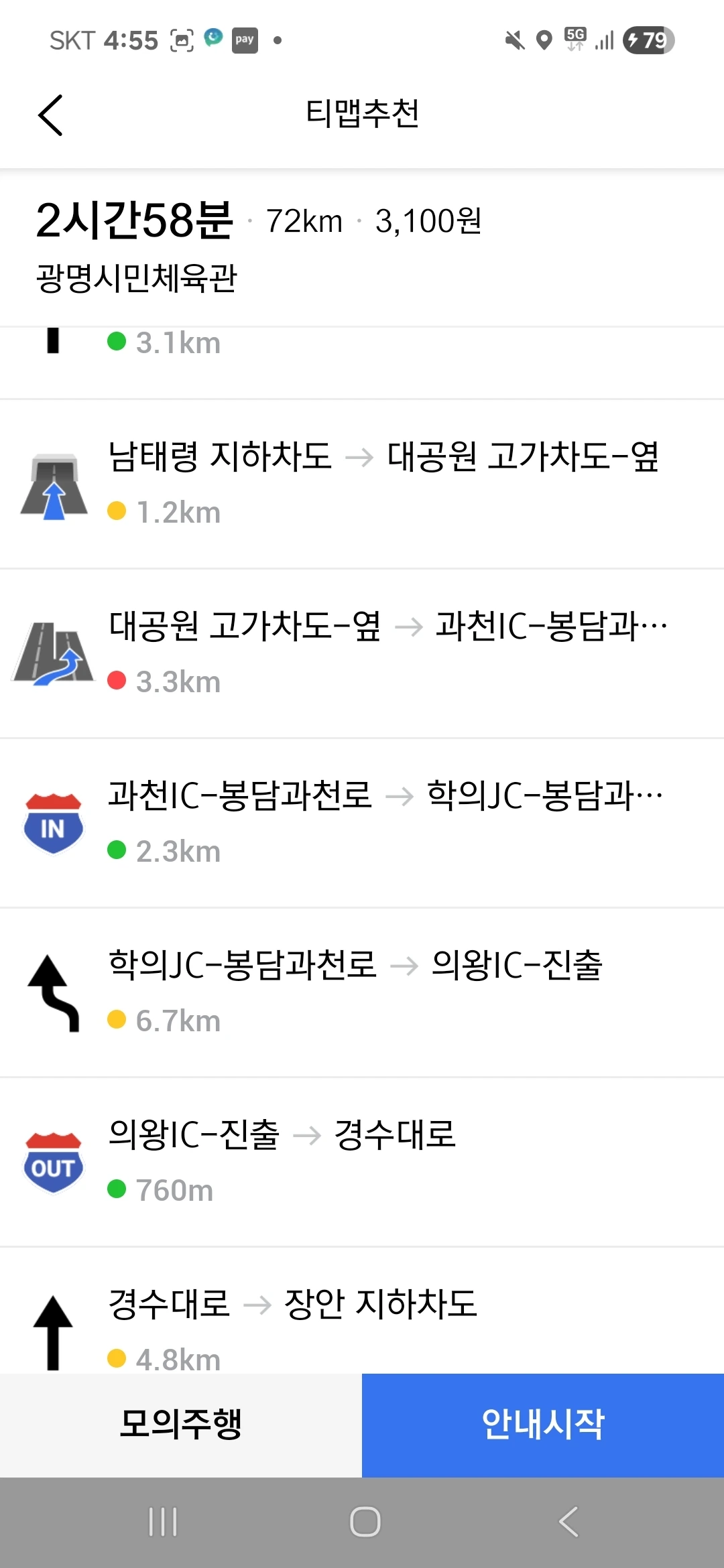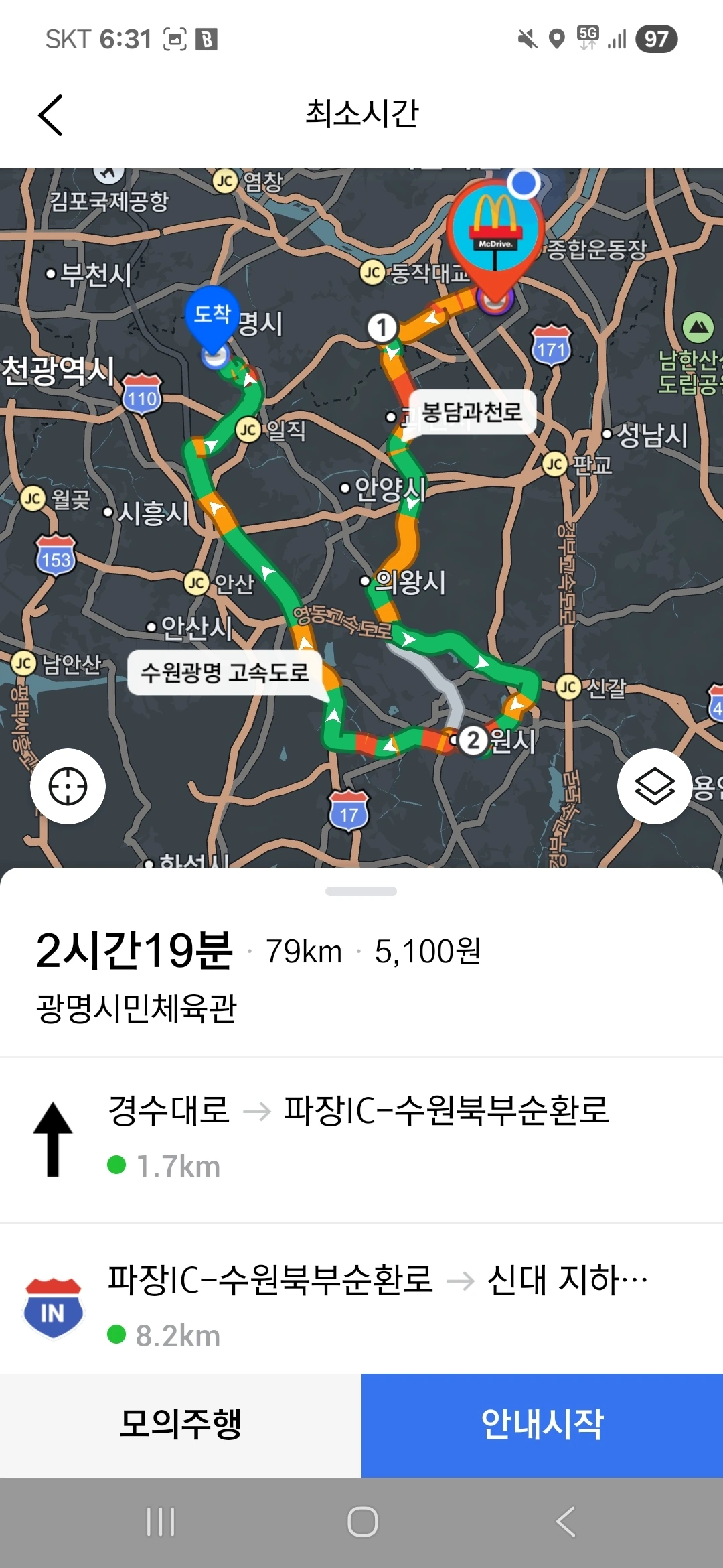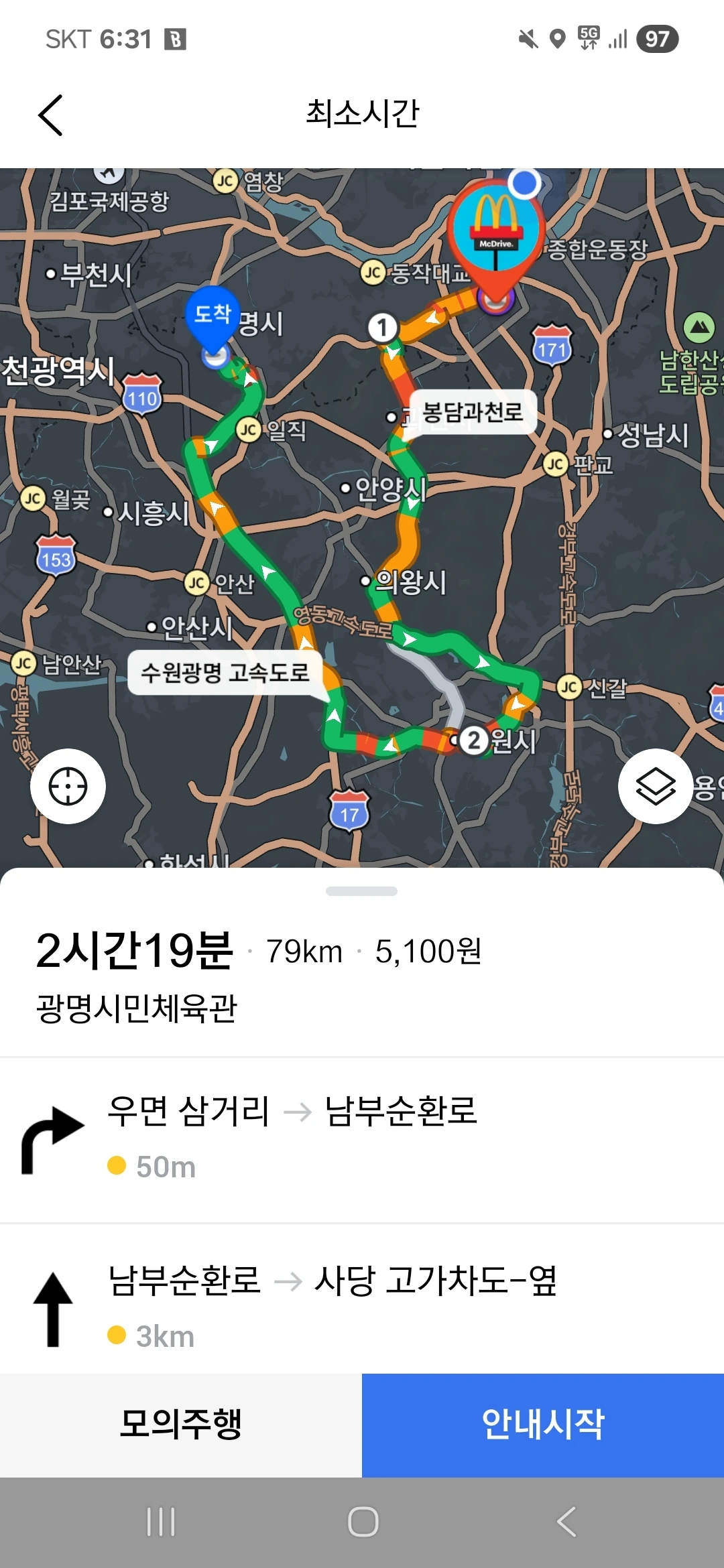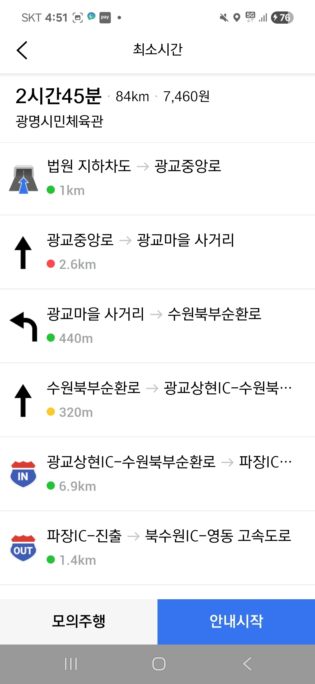 이 상황에서 본하 일행은 본하가 살고 있는 대치동에서 출발하여 양재대로, 강남순환도시고속도로 혹은 남부순환로, 강남순환도시고속도로 등을 거쳐 광명시민체육관으로 이동한다. 또한, 이 상황에서 본하 일행은 항상 승용차를 이용하며, 운전자는 상황에 따라 달라진다.