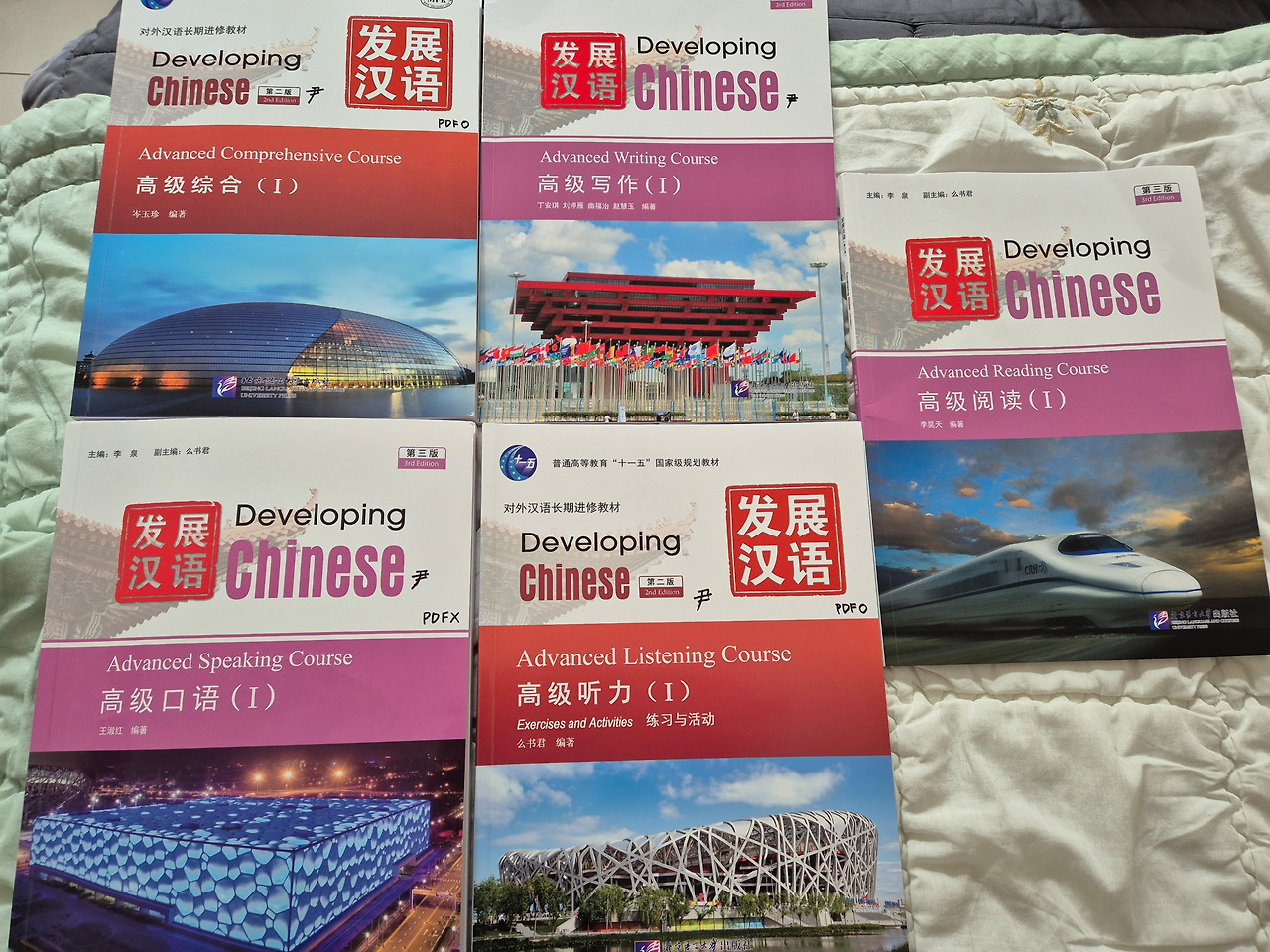 사실 지난 주가 어떻게 지났는지 모르겠어요. 금요일 수업이 끝나자 어찌나 신나던지요. 일주일간 수업에 적응하느라 잔뜩 긴장한 데다 고급반은 새로운 학생이 4~5명 정도밖에 안 돼서 기존 수업을 그대로 진행하는 바람에 책 없이 수업 듣느라 진짜 고생했습니다. 이미 중국도 pdf로 책을 대신하고 있습니다만, 선생님들은 책을 사라고 권하네요. 우리 반은 정원이 30여 명 정도 돼서 말할 기회가 적으니 부지런히 책을 읽으라고 합니다. 근데 학교 안에 서점이 없어요. 선생님들이 그냥 타오바오에서 사래요. 총 5과목으로 타오바오에서 주문했더니 2일 후에 도착했습니다. 젊은 학생들은 pdf로 버티긴 합니다. 저는 선생님 말 잘 듣는 옛날 사람이라 책을 전부 샀어요. 종합, 듣기, 말하기, 읽기, 쓰기 책입니다.