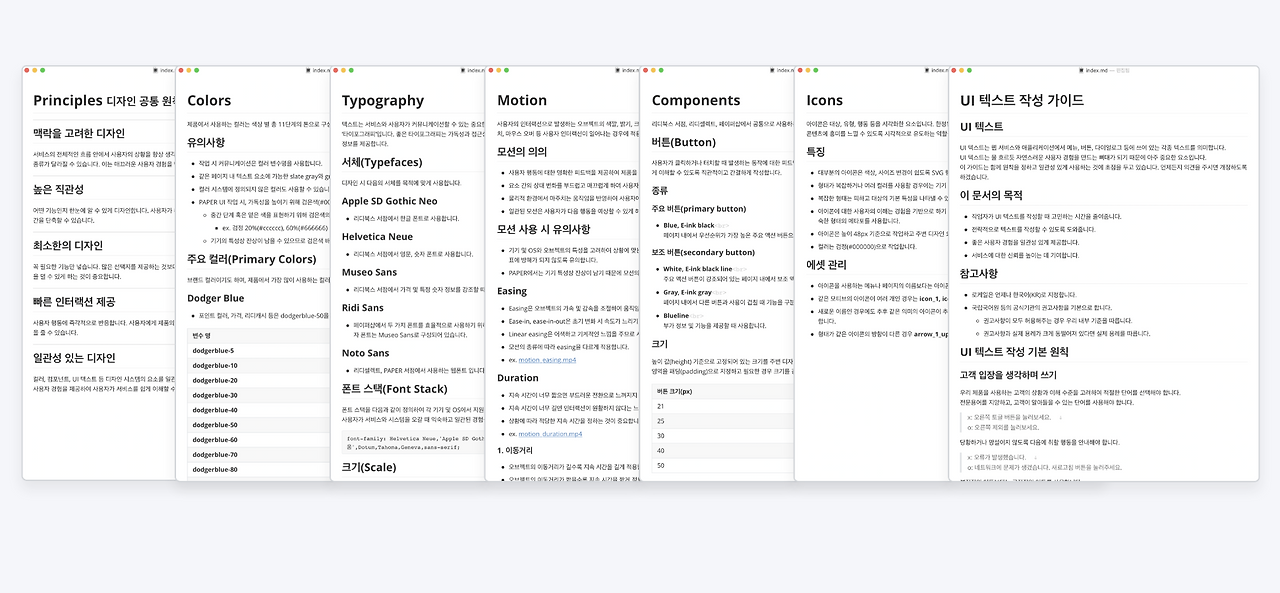 이렇게 디자인 컴포넌트 시스템과 각 컴포넌트 UI에 해당하는 히스토리를 포함한 가이드라인을 통해 디자인 시스템을 구성합니다. 여기서 히스토리란, '하단 메뉴바'라는 UI 컴포넌트를 왜 사용하게 되었는지 어디서 사용되고 어디서는 사용안되는지, 어떨때 나오게 되는지 등의 정책을 의미합니다.