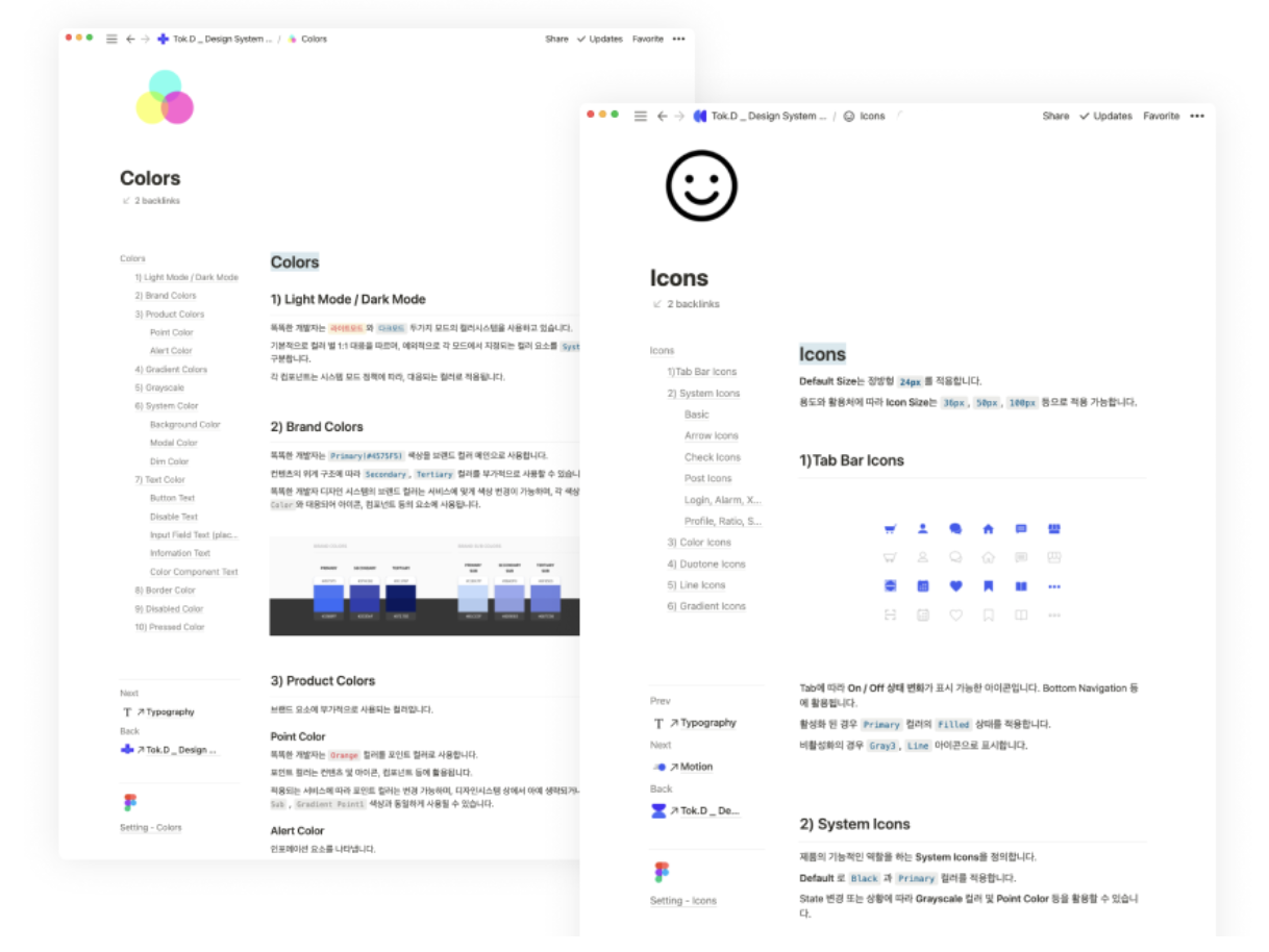 위의 사진은 리디북스의 문서화된 디자인 가이드라인 입니다. 이러한 문서화된 가이드라인을 통해 공유된 언어를 통해 팀원 각각이 같은 멘탈모델을 가지고 커뮤니케이션 할 수 있습니다. 문서화는 주로 Notion을 이용합니다.