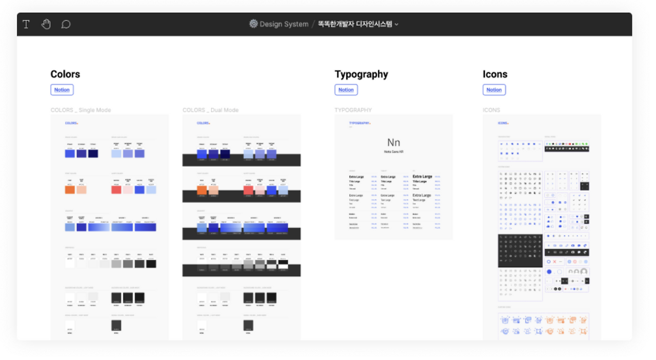효율적인 디자인 시스템은 하나의 Figma와 연결된 Notion 파일로 디자인 에셋을 적용하며, 가이드라인을 관리합니다.