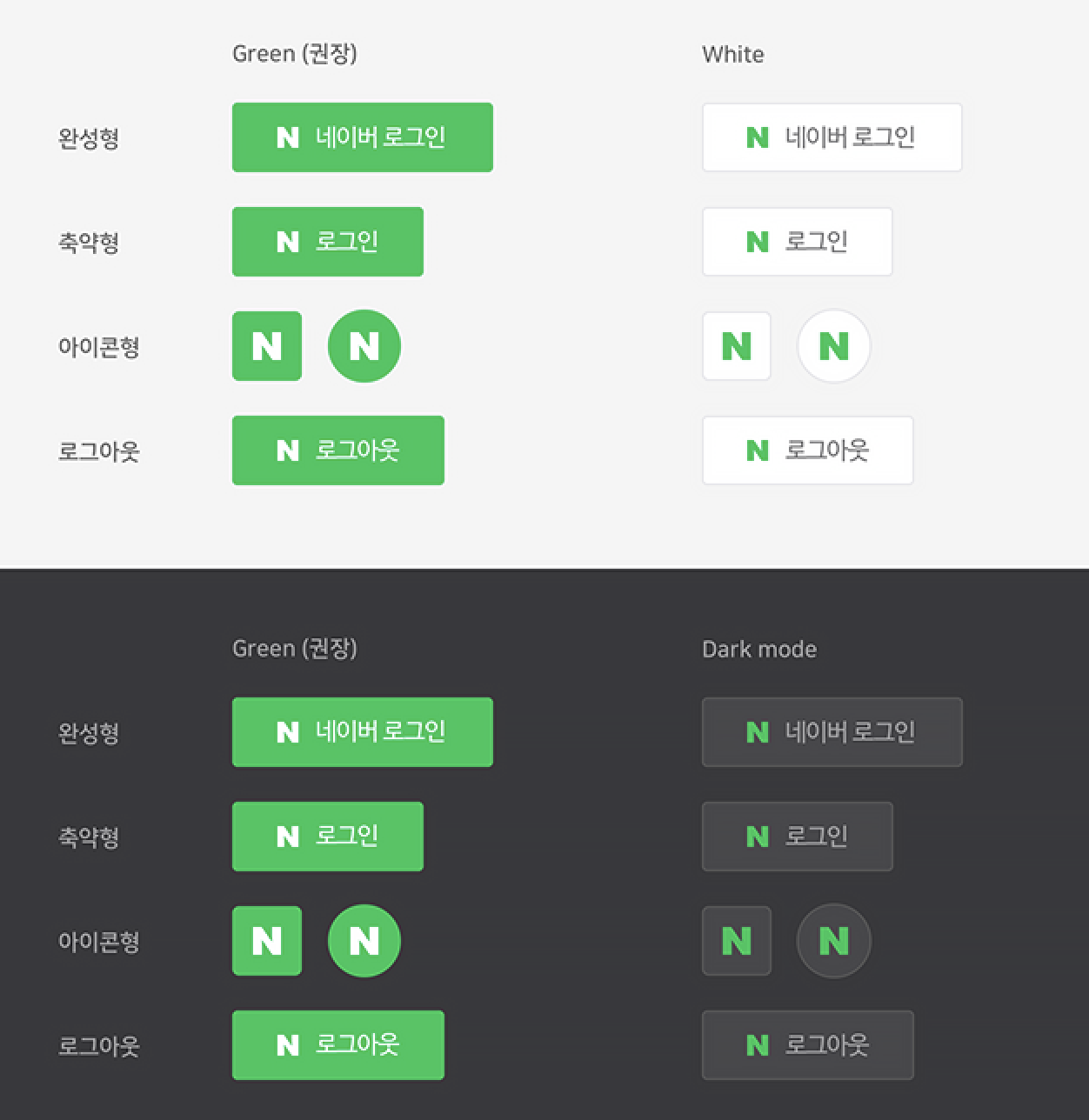 이 가이드라인은 피그마에 나와있습니다. 아래 링크는 네이버 가이드라인 링크입니다. 네이버는 원형으로도 소셜 로그인 버튼을 만들 수있고 유동적으로 잘 만들어져 있습니다.