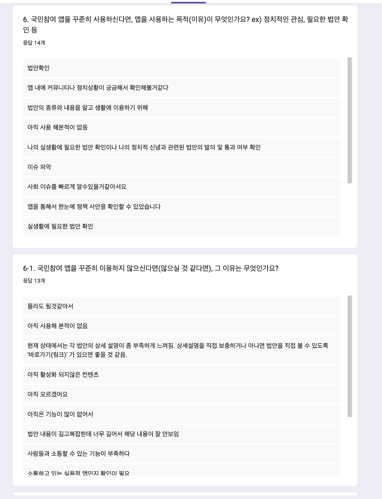 국민참여 앱을 사용한다면 무엇때문에 사용하는지, 사용하지 않는다면 무엇때문에 이탈하는지를 계속 물어보았고 앱을 사용하는 사용자의 목적에 대해서 몇가지 인사이트를 얻을 수 있었습니다.