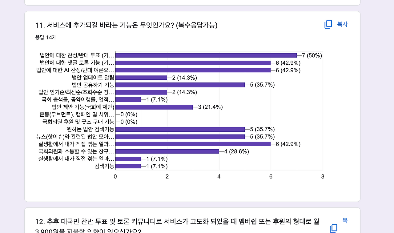 결론은 사용자들은 서비스에 흥미를 갖긴 하지만 경험 부분에서 아직 버전1이라 기능도 없고 어려운 법률안을 나열한 내용이 다소 딱딱하게 느껴진다는 것이였습니다.