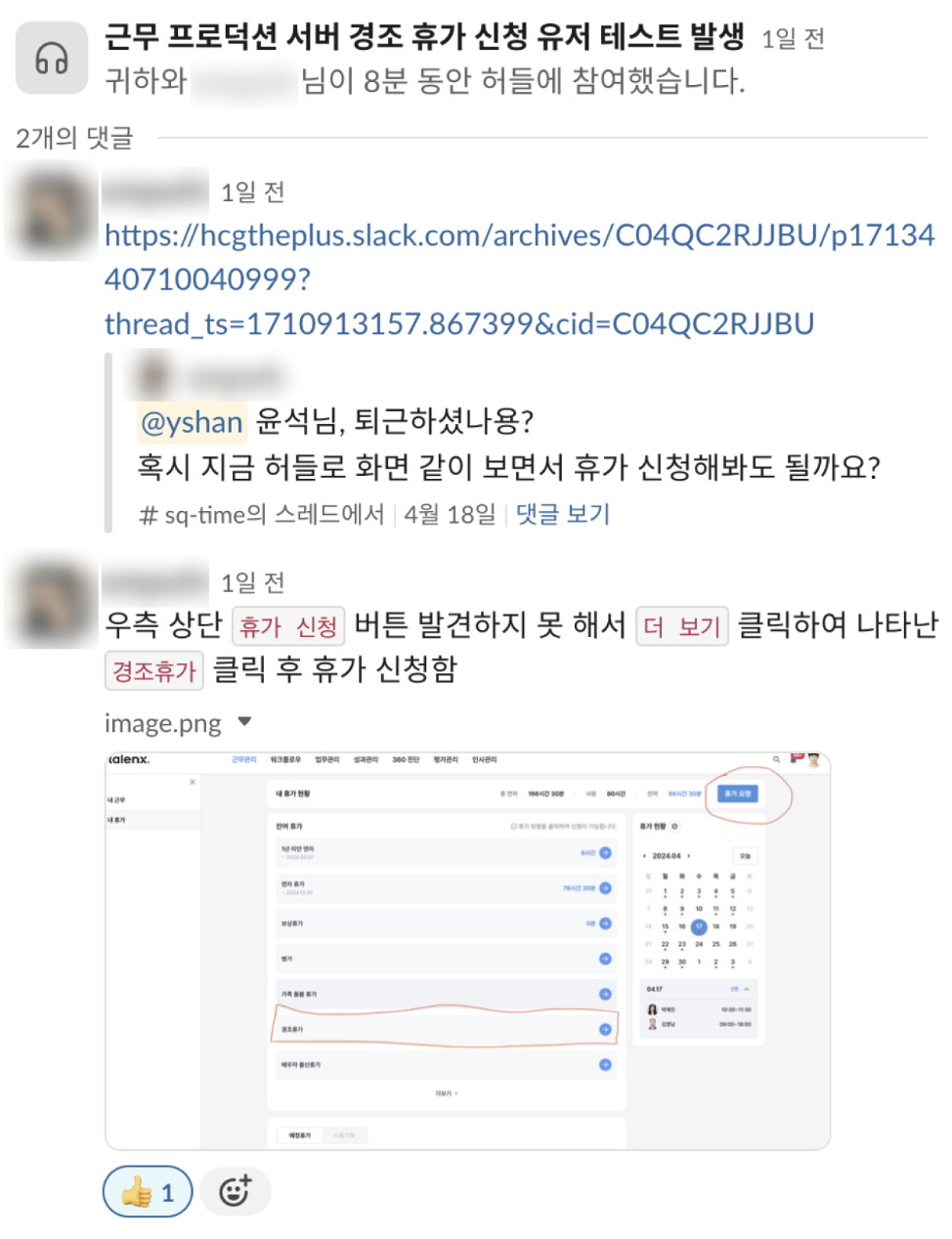 사용하는 것을 확인하면서 반응과 휴가 신청까지 플로우를 관찰하였습니다.