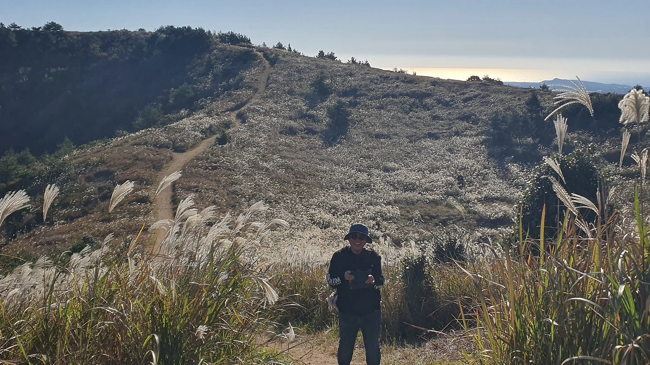 오름이 움직이지 않는 오름이니 얼마나 다행인가. 20년 동안 그 자리에 그대로 있으니 친구는 기억을 더듬어 앞장 선다. 3개의 큰 분화구와 작은 오름들 6개가 연결되어 높지도 않은 오름을 오르면 바로 분화구 안으로 걸어서 저쪽으로 지나갈 수 있다. 분화구 안에 낮은 억새풀들이 한들한들 에 휘몰아친다.