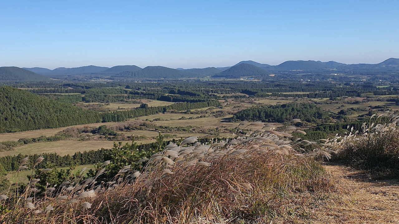 오름 정상에 오르면 한라산 정상까지 아무것도 거치는게 없이 시원하게 펼쳐져있다. 오름 아래로는 제주 전통 방식대로 삼나무로 밭과 말 목장의 경계를 두룬 것이 잘 보인다.