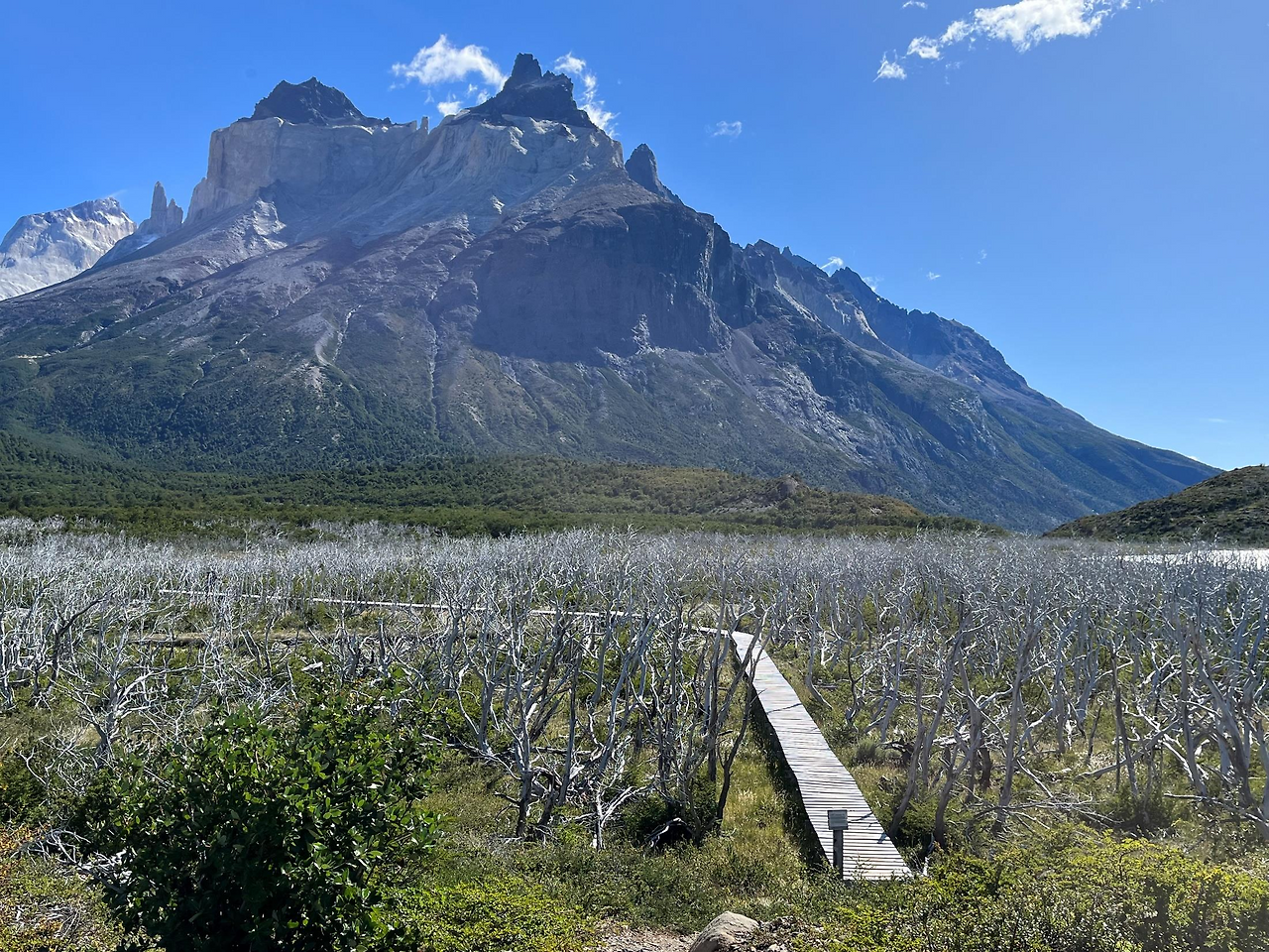 프렌치 계곡으로 오르기 직전 본디 초록으로 우거졌을 저 평야를 고사목들이 장관을 이루고 있었다. 마침 이곳에 천상의 다리 처럼 하얀 나무다리가 한적하게 설치되어있다. 표지판에는 미국의 유명 아웃도어 기업인 REI 그룹이 파타고니아 자연보호를 위해 곳곳에 다리도 설치하고 기부활동을 한다고 했다. 그냥 자연보호가 아니라 인간이 자연을 훼손하지않으면서 자연을 즐기고 자연속에서 재생할 수 있게한다. 이 다리를 따라 걷고있는 시간 만큼은 자연과 인간, 생명과 죽음이 한데 어우러져 있다.