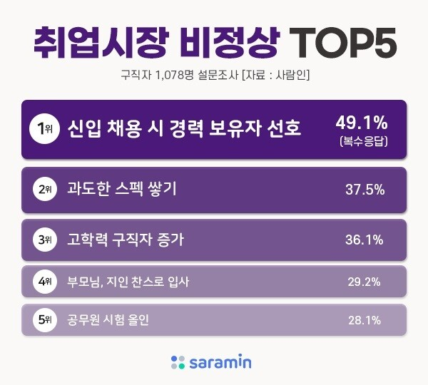 한 언론보도에 따르면 2021년 사람인에서 취준생들을 대상으로 취업시장의 비정상적 문화에 대한 조사(복수응답) 결과, 취준생들은 신입 채용에 경력직 우대(49.1%), 과도한 스펙 쌓기(37.5%), 고학력 구직자 증가(36.1%) 등에 크게 염증을 느끼고 있었다고 한다. 전경련에서도 경력 같은 신입을 선호하는 현상은 기업 입장에선 어쩔수 없다고 한다.