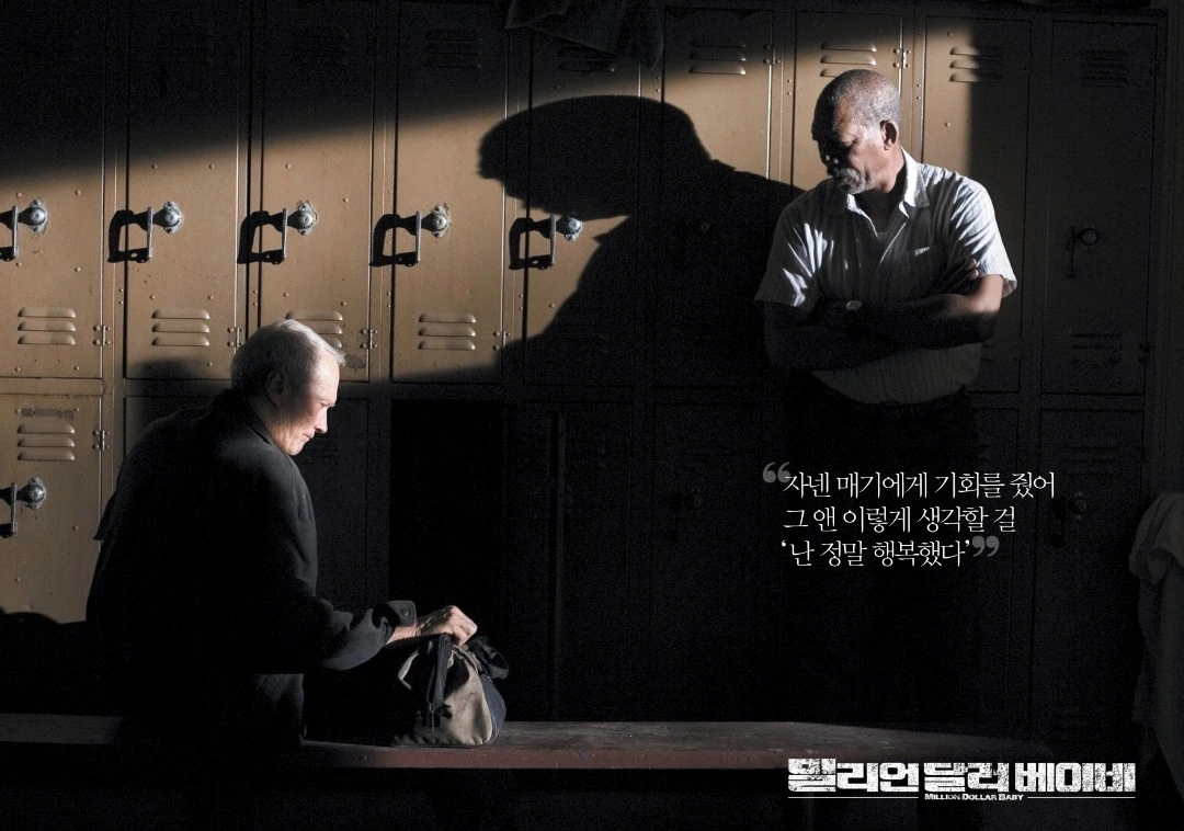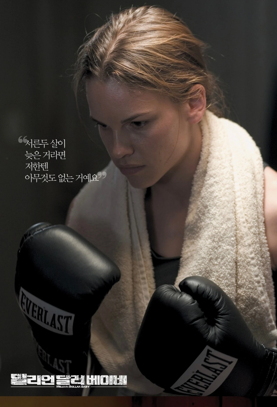 인생에 좋은 어른을 만난다는 것. 매기는 복싱을 제대로 배우기 전에도 혼자 나름 복싱을 해본다며 개인훈련을 해왔다. 프랭키 코치를 찾아온 걸로 보아 아마 평소 관심을 갖고있다가 그의 코칭 스타일을 좋아하게 되었나보다. 프 랭키는 그녀가 나이가 많고 돈도 없고 여자라는 이유로 계속해서 거절했지만 그녀는 포기하지 않고 체육관에서 계속해서 연습한다.