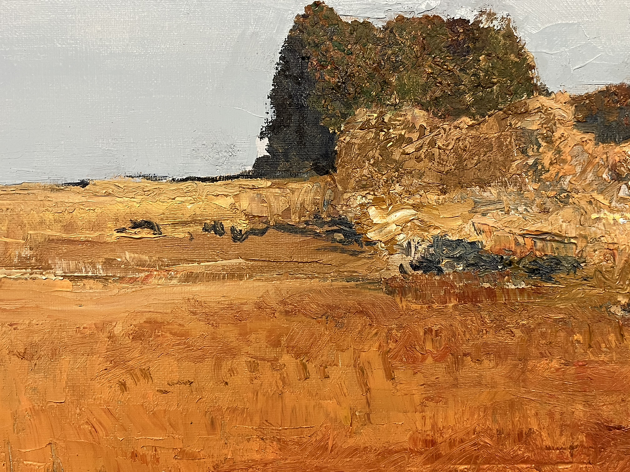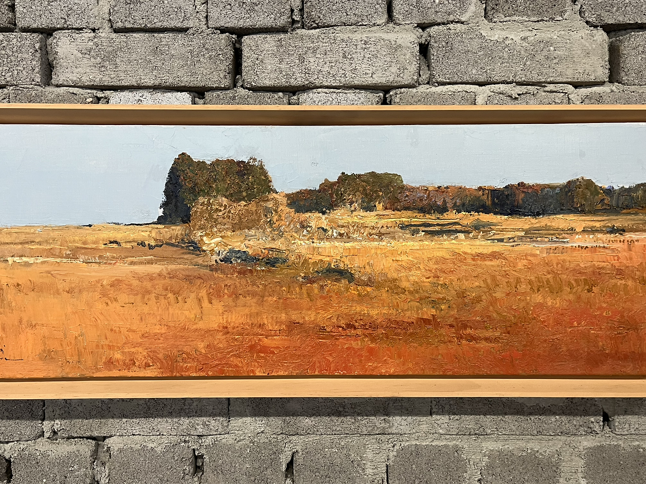 <가을풍경> 2022년 11월에 본 그의 전시에서 가장 기억에 남는건 가을풍경이다. 가로로 긴 작은 크기의 그림인데 가로로 길게 캔버스를 구성한 것도 신의 한수였다. 제주도는 그 자신이 수평으로 길게 낮은것처럼 옆으로 둘러보며 감상하면 좋다. 그 가을에 제주의 들녘은 억새와 이름 모를 풀들과 잡목들이 저마다의 색을 내뿜는다. 특히 제주의 가을색이 육지와 다른 것은 제주엔 논이 없어 익은벼가 내뿜는 풍요로운 황금색을 낼수 없다는 점이다. 그자리는 풍요로움 대신 척박함과 거친 토양의 빛이 채운다.