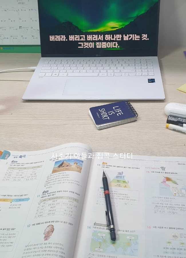 수능도 아닌 고작 중학교 2학년 첫 중간고사가 얼마나 대단한 시험이길래 그렇게나 유난을 떨었나 싶다. 정작 아들은 무덤덤했는데. 사춘기 아들은 여전히 혼자 공부했다. 도서관이나 스터디 카페에 가지도 않고, 학원도 다니지 않았다. 오로지 집에서만. 사실 집이라는 공간이 내 공부 의지력을 꺾을 유혹거리가 너무 많다. 공부하기 싫으면 얼마든지 안 하고 누워 잘 수도 있고, TV도 볼 수 있고, 공부 안 하고 딱 놀기 좋은 환경이다. 가족들이 집에서 공부 분위기를 좀 만들어줘야 하는데 그렇게 못 해줘서 미안한 마음이 컸다. TV 보는 아빠, 동생. 피곤하다고 누워 있는 엄마 때문에 사춘기 아들은 공부가 잘 안 될 법도 한데, 묵묵히 혼자서 공부하면서 필요할 때만 엄마의 도움을 요청했다. 사실 혼자 하는 공부는 외롭고 참 힘들다. 사춘기 아들은 마음을 다잡아 주는 유튜브 공부 영상과 함께 힘든 시험공부와 싸우고 있었다.