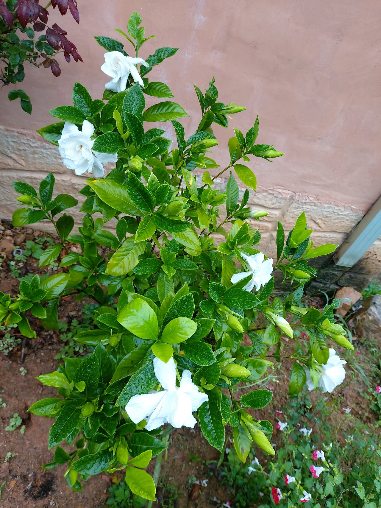4,5년 전쯤 앞마당 장미 옆에 심었던 치자가 꽃을 제대로 피워내고 그 상큼한 향을 내뿜는 중이다.