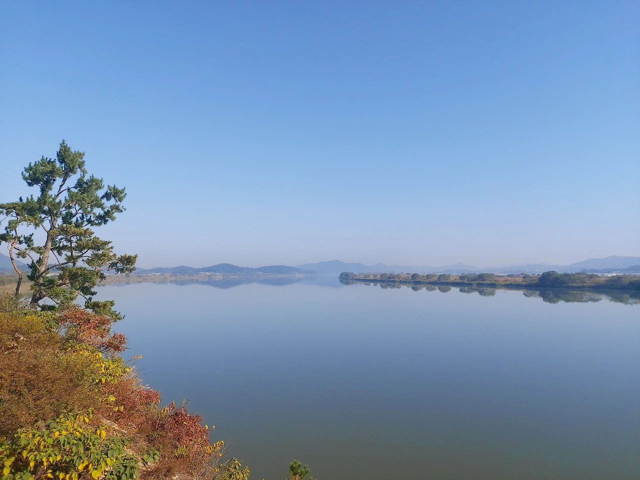 날씨는 한없이 쾌청하고 시원하다. 강에는 약간의 물안개가 피어올라 풍경에 더한다. 강을 따라서 영산포를 지나자 고수부지에 억새가 은빛 물결을 이루고 강을 둘러싼 산에는 여기저기 울긋불긋 단풍이 아름답다.