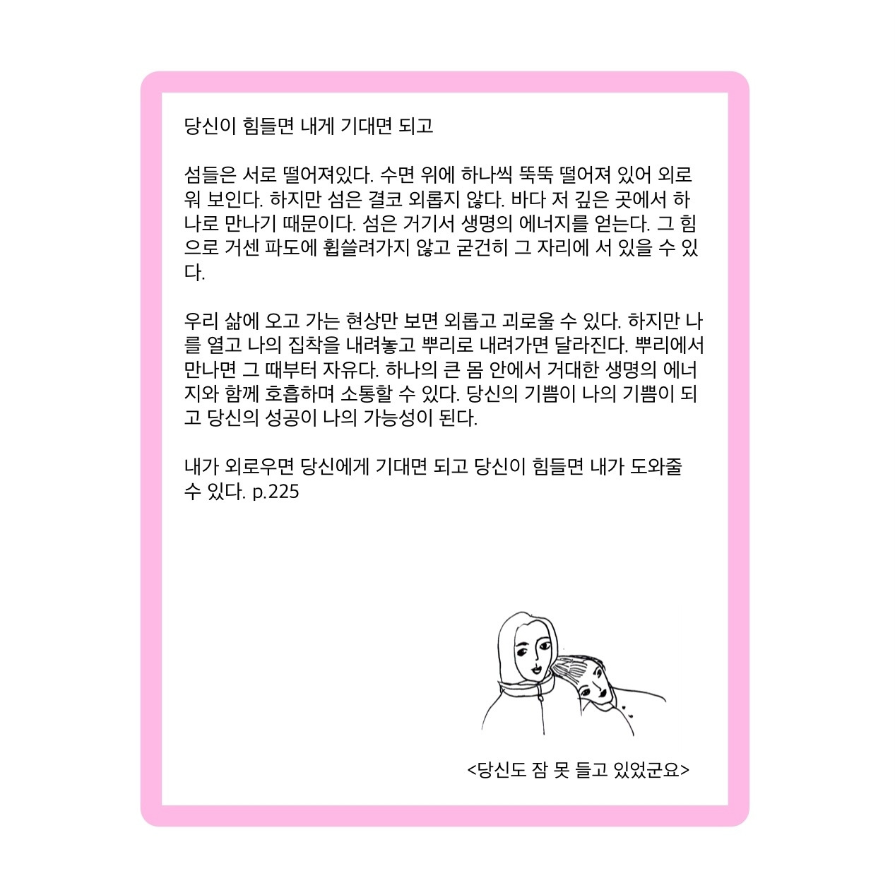 내가 외로우면 당신에게 기대면 되고 당신이 힘들면 내가 도와줄 수 있다. p.225