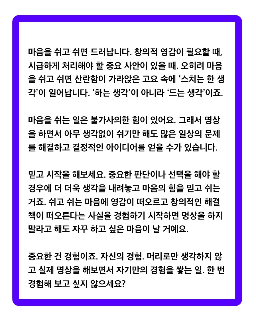 중요한 판단이나 선택을 해야 할 경우에 더 더욱 생각을 내려놓고 마음의 힘을 믿고 쉬는 거죠.