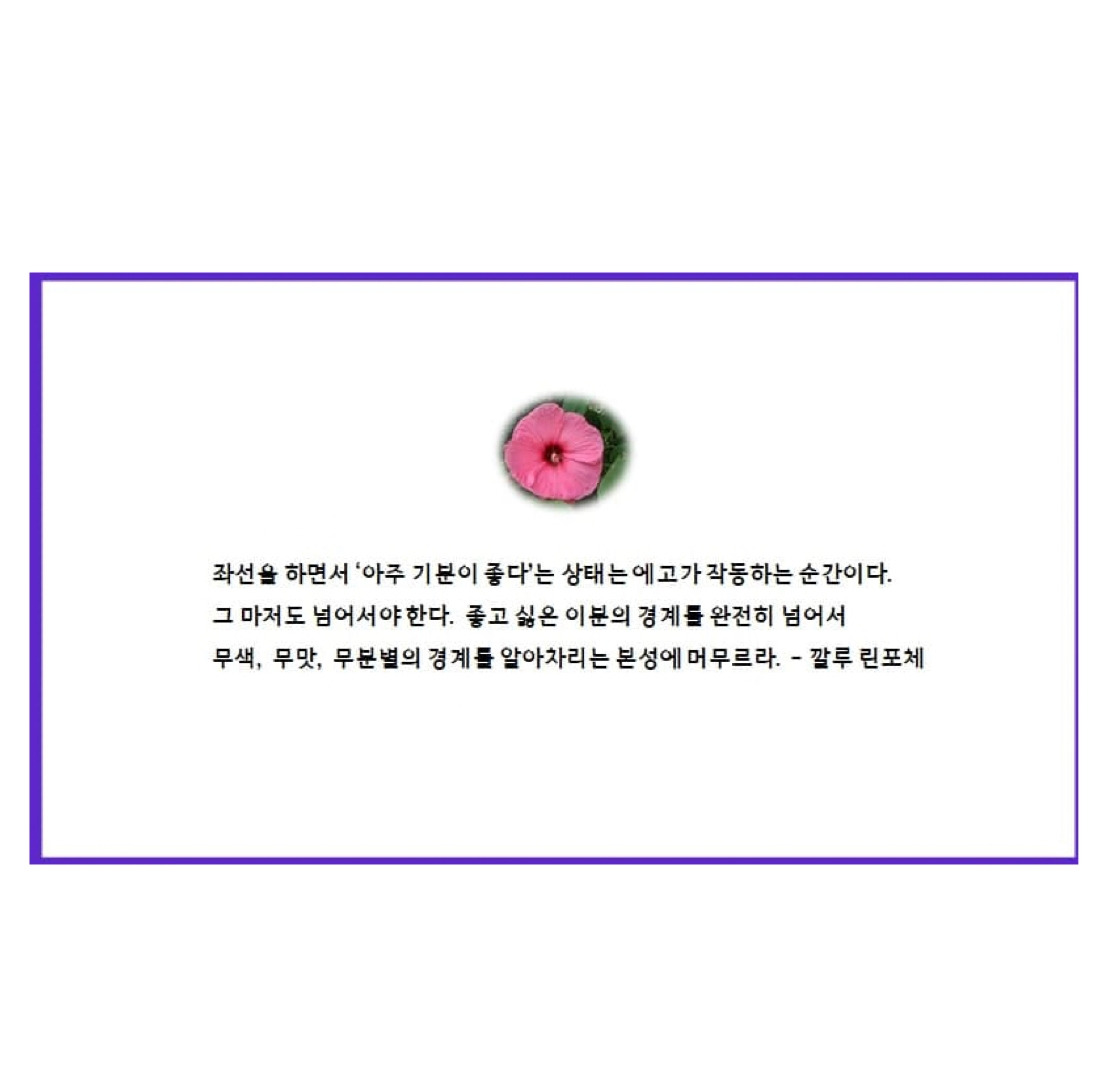 아직 갈 길은 멀지만 이런 기분을 느낄 수 있을 정도는 산란함이 많이 사라졌다는 점에서는 좋은 신호입니다. 중요한 것은 거기에 안주하지 말라는 겁니다. ‘이 기분 좋아.’ ‘지난 번엔 기분좋은 상태가 꽤 오래 지속되었는데’ ‘어떻게 했더라’ 이런 식으로 좋았던 경험에 안주하지 말라는 거죠.