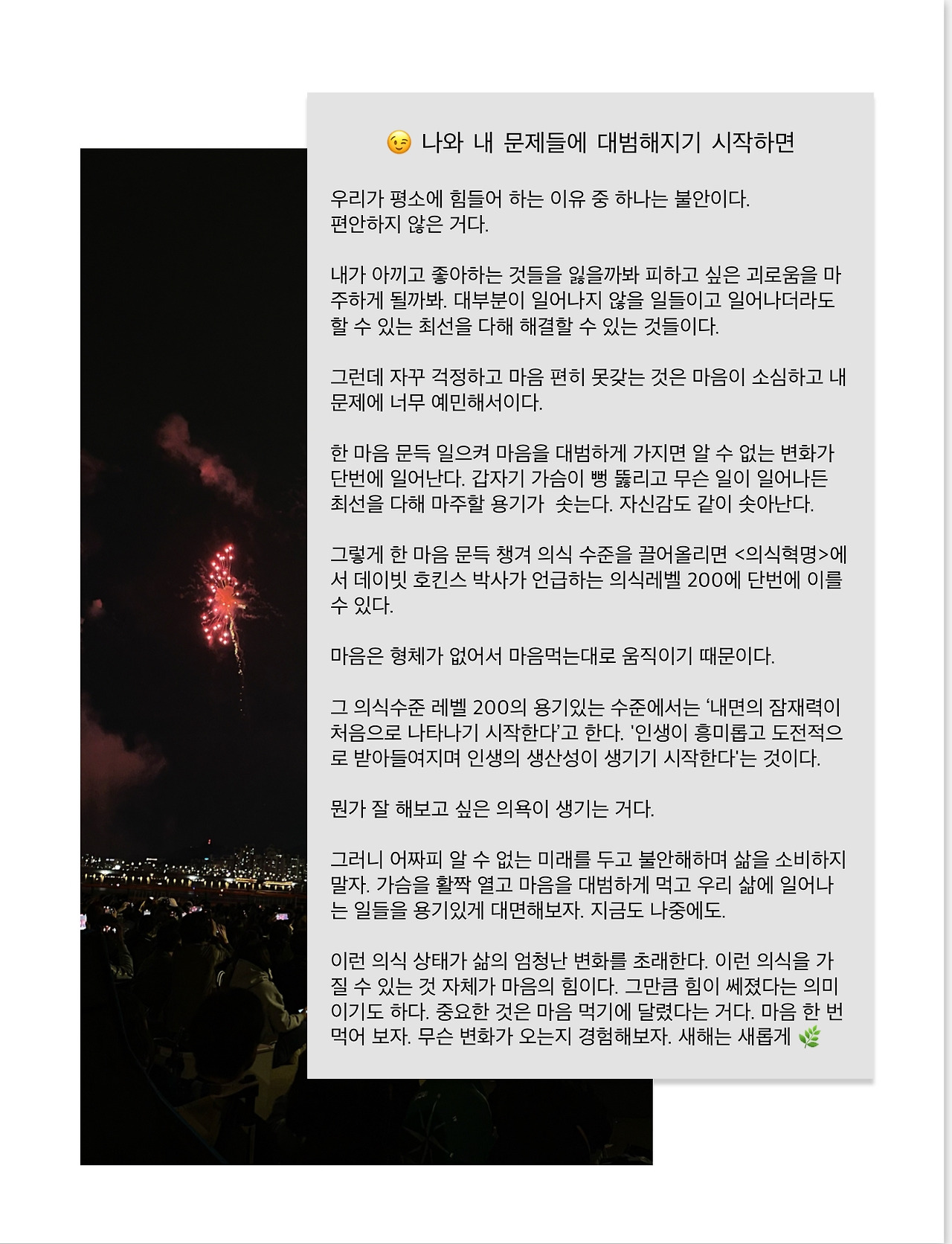 이런 의식 상태가 삶의 엄청난 변화를 초래한다. 이런 의식을 가질 수 있는 것 자체가 마음의 힘이다. 그만큼 힘이 쎄졌다는 의미이기도 하다. 중요한 것은 마음먹기에 달렸다는 거다. 마음 한 번 먹어 보자. 무슨 변화가 오는지 경험해 보자. 새해는 새롭게