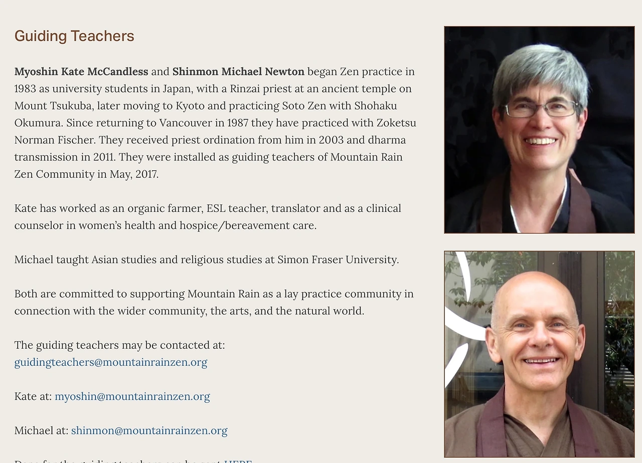 센터에는 마이클 말고도 케이트라고 하는 여자 스님이 있었다. 처음에 머리 깎은 남자스님만 스님이고, 케이트는 경력이 많은 여자 신도인 줄 알았다. 서양이라 승복이나 법복이 격식을 갖추기에는 턱없이 부족해서 간단히 법락만 두르기도 하고 편하게 옷을 입었기 때문이다. 후에 알고보니 케이트도 스님이었다. 두 스님이 마운틴 레인 젠도를 이끌고 있었던 것이다. 그래서 두 스님이 공평하게 역할을 나누어서 좌선이나 법회가 원할하게 굴러가도록 살피고 이끌었다.