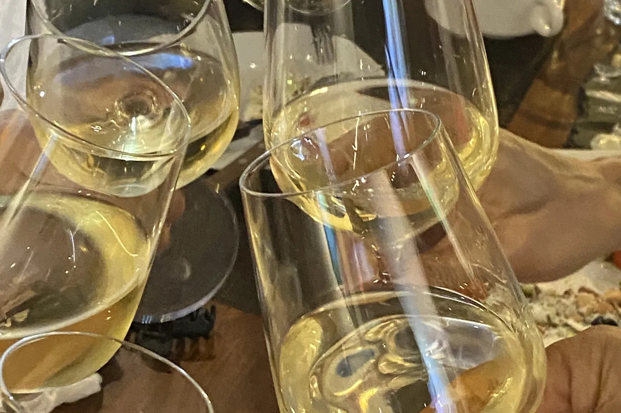 지인들과 와인잔을 부딪치며 하우스콘서트를