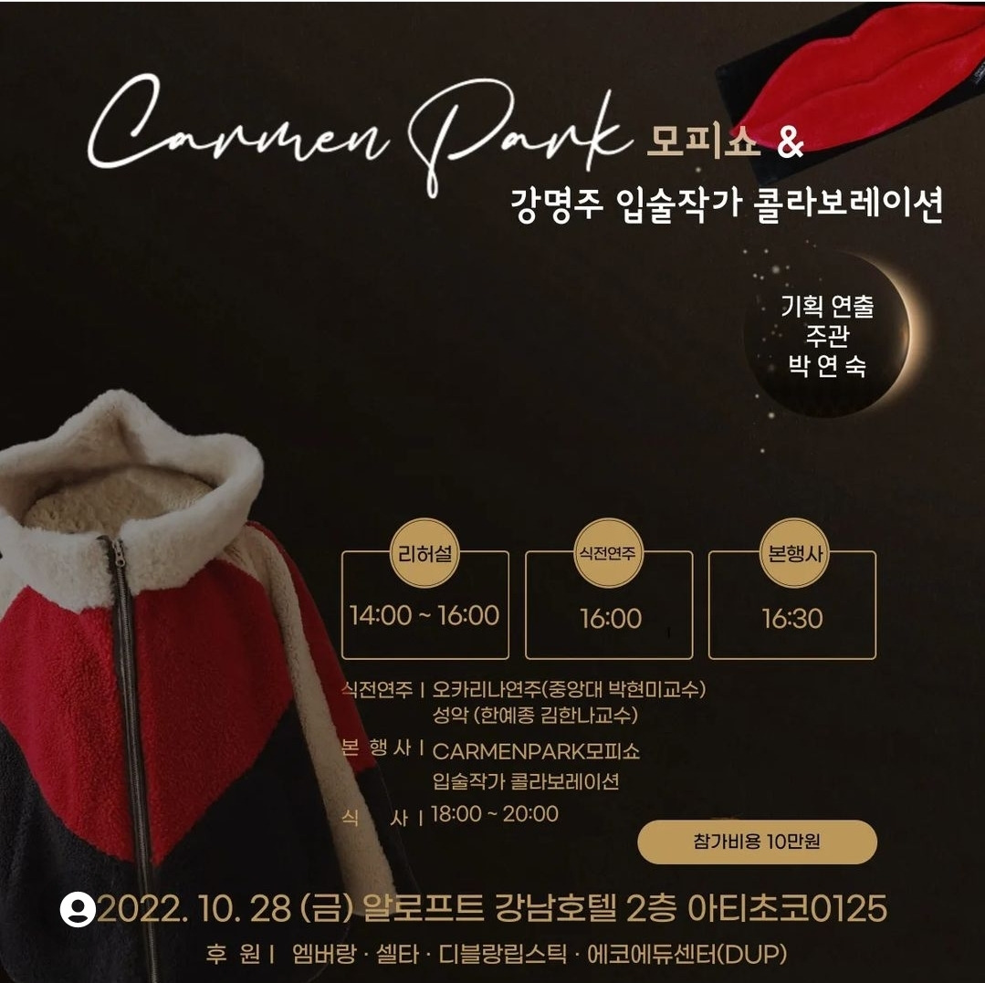 이번 행사는 "CarmenPark모피"와 "강명주입술작가님의 작품"들이