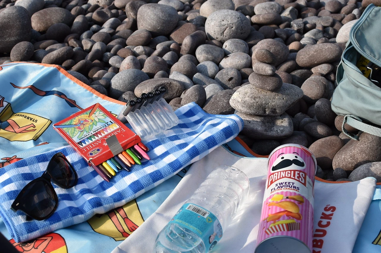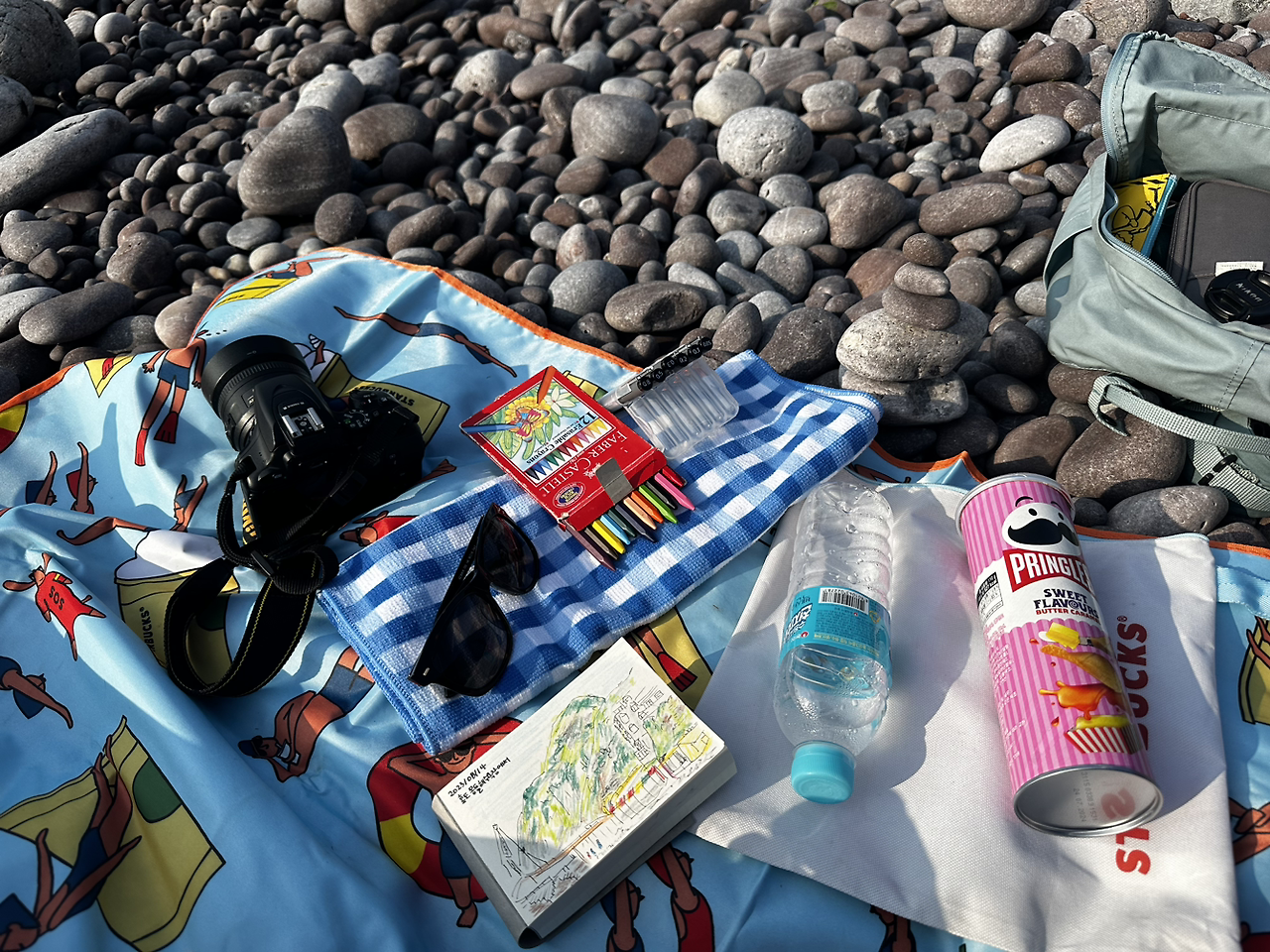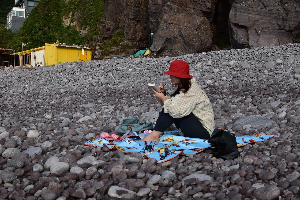 돗자리와 색연필, 노트, 펜, 간식 등 한가득 가방에 챙기고서 간 곳은 숙소 바로 뒤에 위치한 몽돌해수욕장. 뜨거운 태양을 피한다고 3~4시쯤 갔지만 여전히 뜨거운 게 여름은 여름이었다.